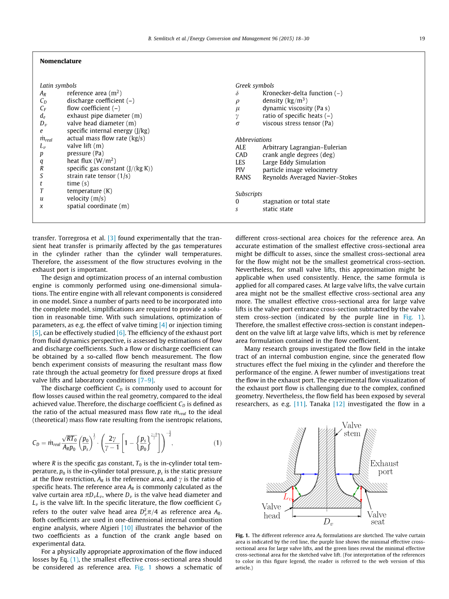 其中R是比气体常数,是缸内总温度,是缸内总压力,是流量约束下的静态压力,是参考面积,是比热比。参考区域通常计算为阀幕面积,其中是气门头直径,是气门升程。在具体文献中,流量系数是指外部阀头面积作为参照区域。这两个系数都用于一维内燃机分析,其中Algieri[10]基于实验数据说明了两个系数作为曲柄角的函数。
