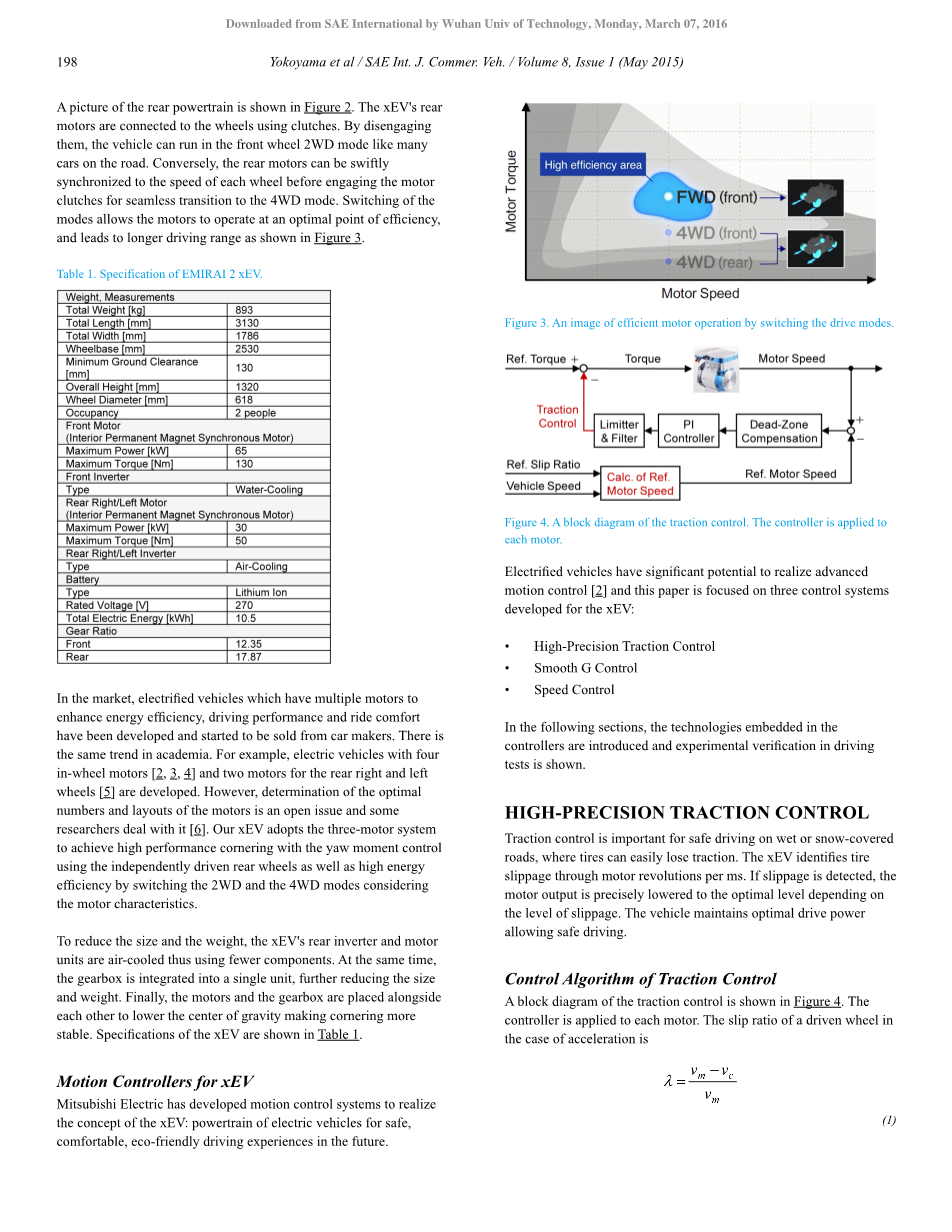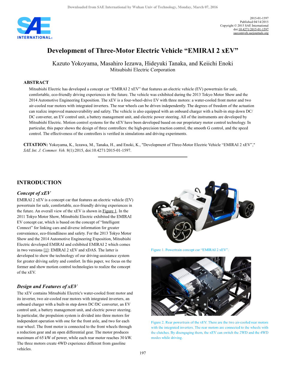 三菱电机开发出了概念车“EMIRAI 2 XEV”,其特点是未来安全、舒适、环保驾驶体验的电动汽车(EV)动力系统。该车辆已经在2013年东京车展和2014年汽车工程博览会期间展出。该XEV是三个电机的四轮驱动电动汽车:一个前置水冷电机和两个后置风冷电机,带集成逆变器。后轮可独立驱动,驱动的自由度可实现改善的可操作性和安全性。该车辆还装备了带一个内置降压DC/DC转换器的车载充电器,电动汽车控制单元,电池管理单元,以及电动助力转向。所有装置都由三菱电机开发。XEV的运动控制系统已经根据我们的电机控制专利技术开发出来。特别是,本文展示了三个控制器的设计:高精度的牵引力控制,平顺G控制和速度控制。控制器的有效性通过模拟和驾驶实验进行验证。