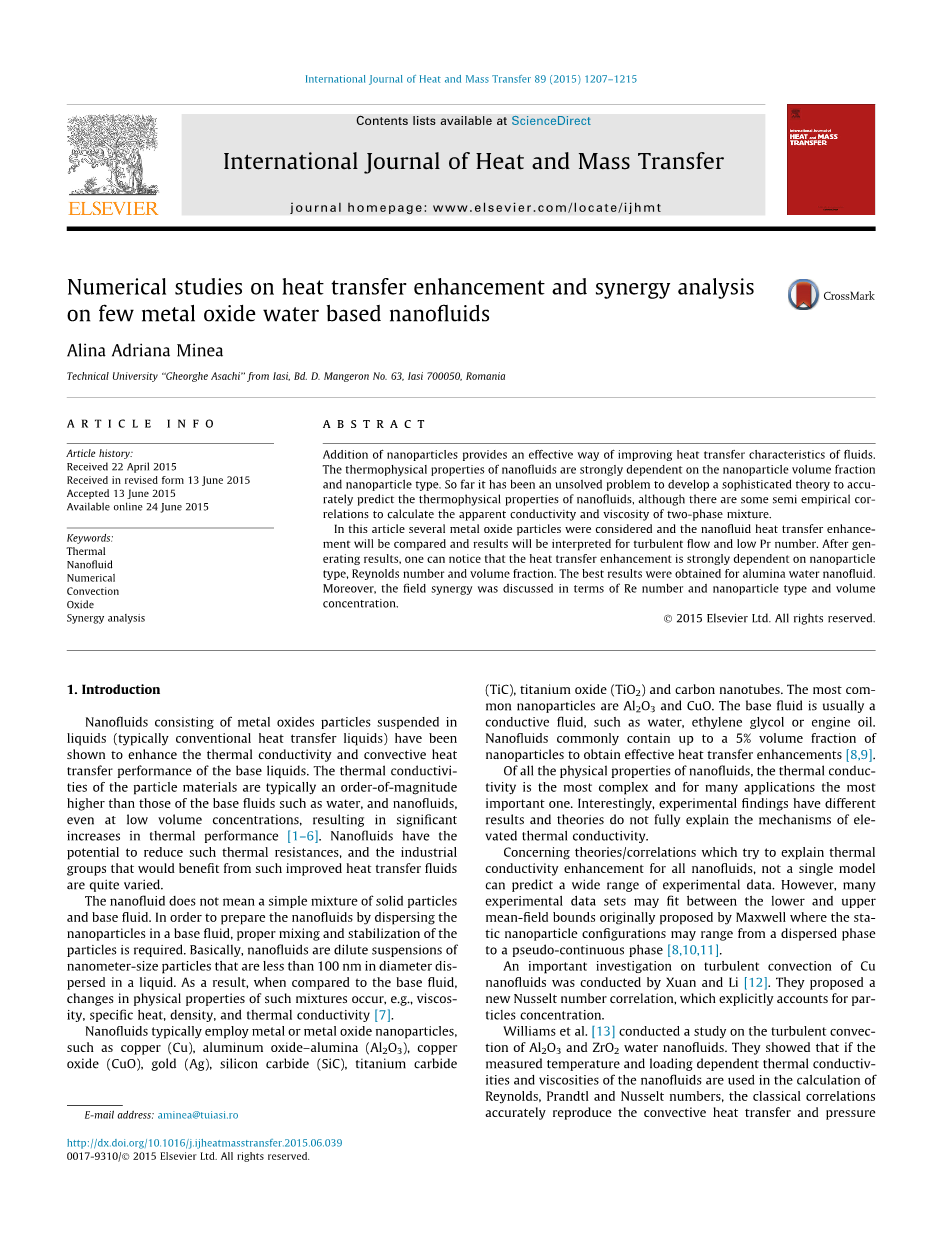 在这篇文章主要研究几种金属氧化物纳米流体在湍流流动和低Pr数条件下的结果来比较流体的强化传热。通过产生的结果,可以发现,强化传热很大程度上是取决于纳米粒子的类型、雷诺数和体积分数。氧化铝/水纳米流体是最好的实验材料。此外,也研究了雷诺数、纳米粒子的类型和体积浓度各个因素相互之间对强化传热的影响。