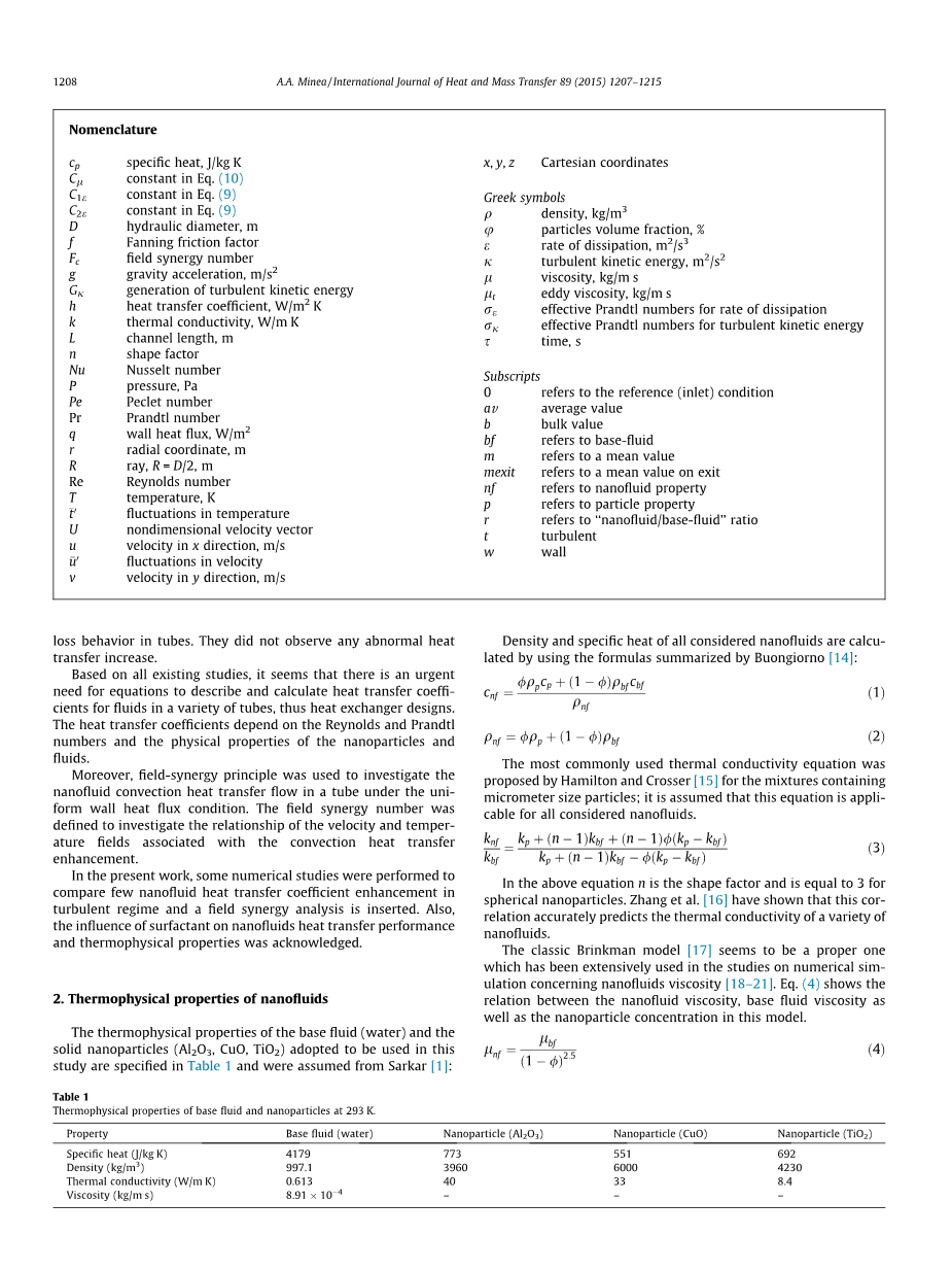 由轩和李[12]进行的对铜纳米流体的湍流对流是一项非常重要的研究。他们提出了一个新的努塞尔数,可以明确说明颗粒物浓度所占有的比例。