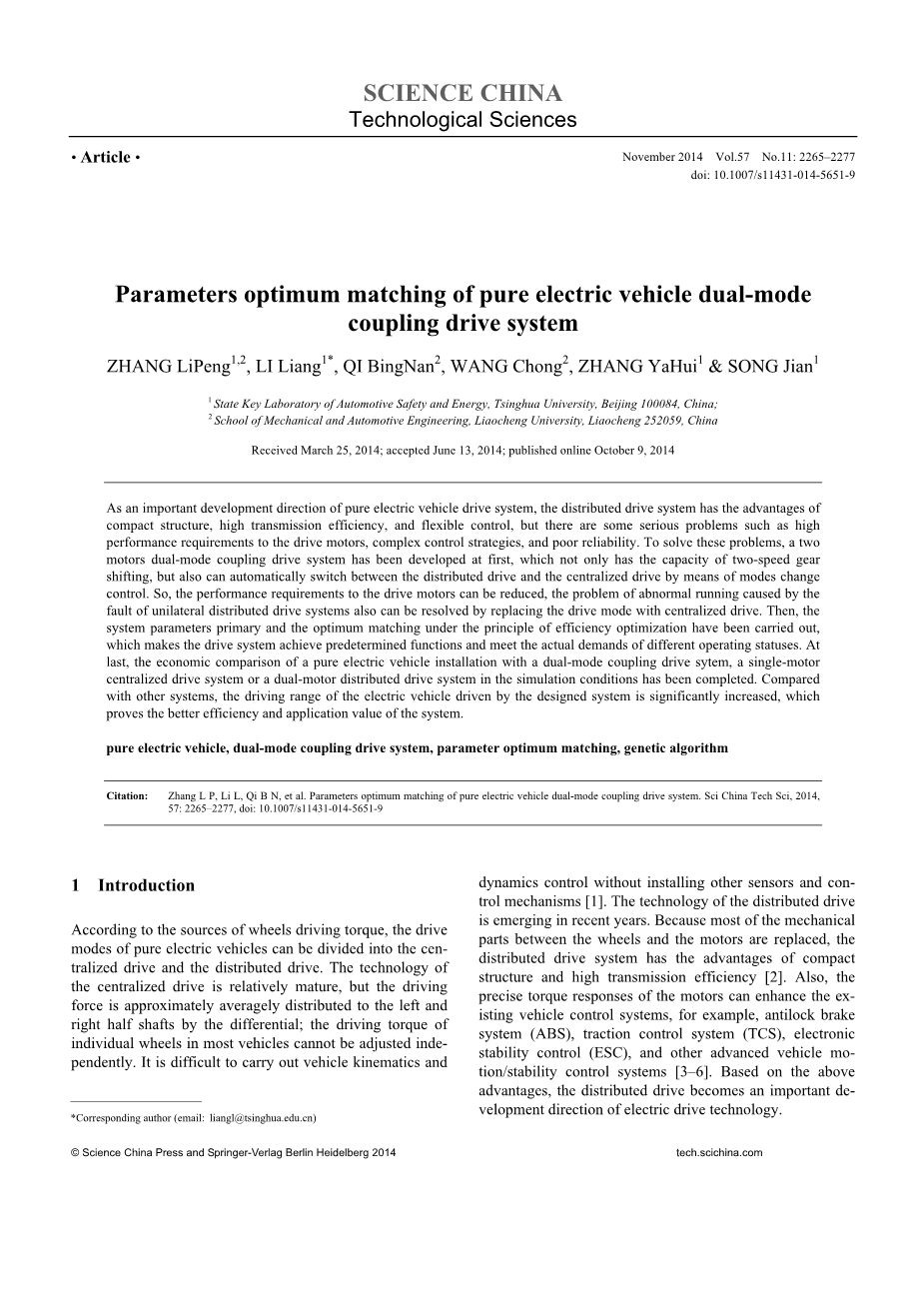 首先,基于初步研究,具体的双模耦合驱动系统结构和它的模式切换机制在本文中已被研究出来。其次,为了验证驱动系统的实际性能,通过选择特定的目标车辆和驾驶条件以及基于最优化的效率原则上,参数优化匹配的驱动系统已经完成,关于分布式驱动和集中式驱动的驱动电机的转矩分配策略及最优选择方法已经论述过。最后,安装有双模耦合驱动系统,单电机集中驱动系统,或者双电机分布式驱动系统的经济模拟比较已经完成,证明了双模耦合驱动系统的优越性。它奠定了新型驱动系统的应用基础。