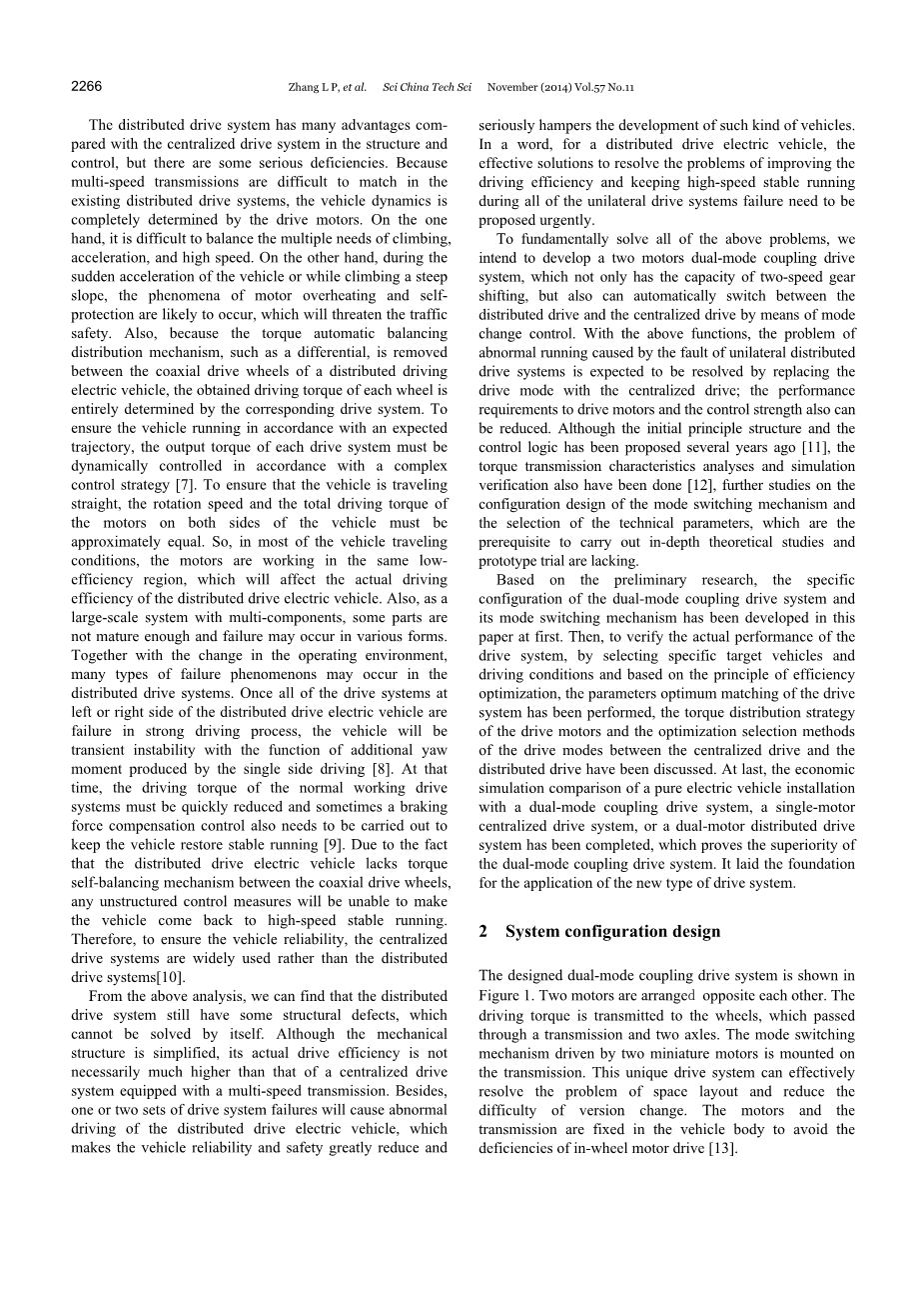 在结构和控制上分布式驱动系统相比集中式有许多优点,但也有一些严重的缺陷。因为多速传输难以匹配现有的分布式驱动系统,所以车辆动力学完全由驱动电机决定。一方面,在爬坡度,加速度,高速之间难以平衡。另一方面,在汽车的突然加速或爬陡坡时,电机过热和自保护的现象有可能发生,这将威胁到交通安全。此外,由于转矩自动平衡分配机制,如差分,被删除在分布式驱动电动汽车同轴驱动轮之间,每一个车轮的驱动转矩完全由相应的驱动系统确定。为了确保车辆的运行于预期相一致,每个驱动系统的输出转矩必须处于动态控制,且与复杂的控制策略相一致[7]。为了确保车辆直线行驶,旋转速度和车辆两边的发动机总的驱动转矩必须近似相等。所以,在大多数的车辆行驶情况下,发动机工作在同一个低效率区域,这将影响分布式驱动电动汽车的实际驾驶效率。同时,作为一个拥有多组分的大型系统,一些部分不够成熟或失败可能会以多种情况出现。与操作环境的变化一起的是,许多类型的故障现象可能发生在分布式驱动系统。一旦所有的分布式驱动电动汽车处于左边或右边的驱动系统在剧烈的驾驶环境中失效,车辆将产生由单侧驱动引起的具有偏离航线的瞬态不稳定[8]。在那时,正常工作的驱动系统的驱动转矩必须迅速减少,有时候为了保持车辆恢复稳定运行,刹车强制补偿控制也是需要的[9]。由于分布式驱动电动汽车同轴驱动轮之间缺乏转矩自动平衡机制的事实,导致任何非结构化的控制措施将无法使车辆回到高速稳定运行。因此,确保车辆的可靠性,广泛使用的是集中驱动系统,而不是分布式的驱动系统[10]。