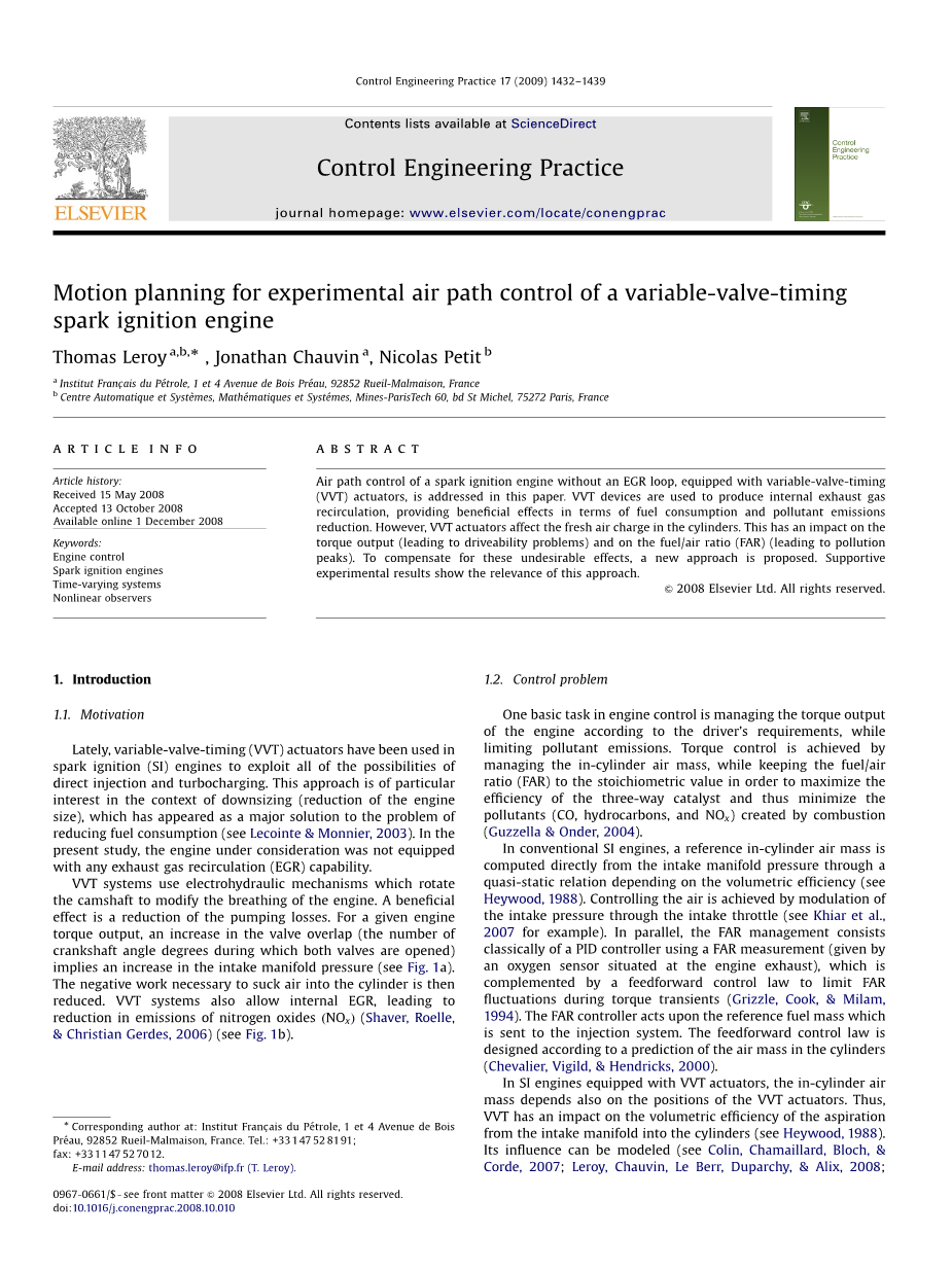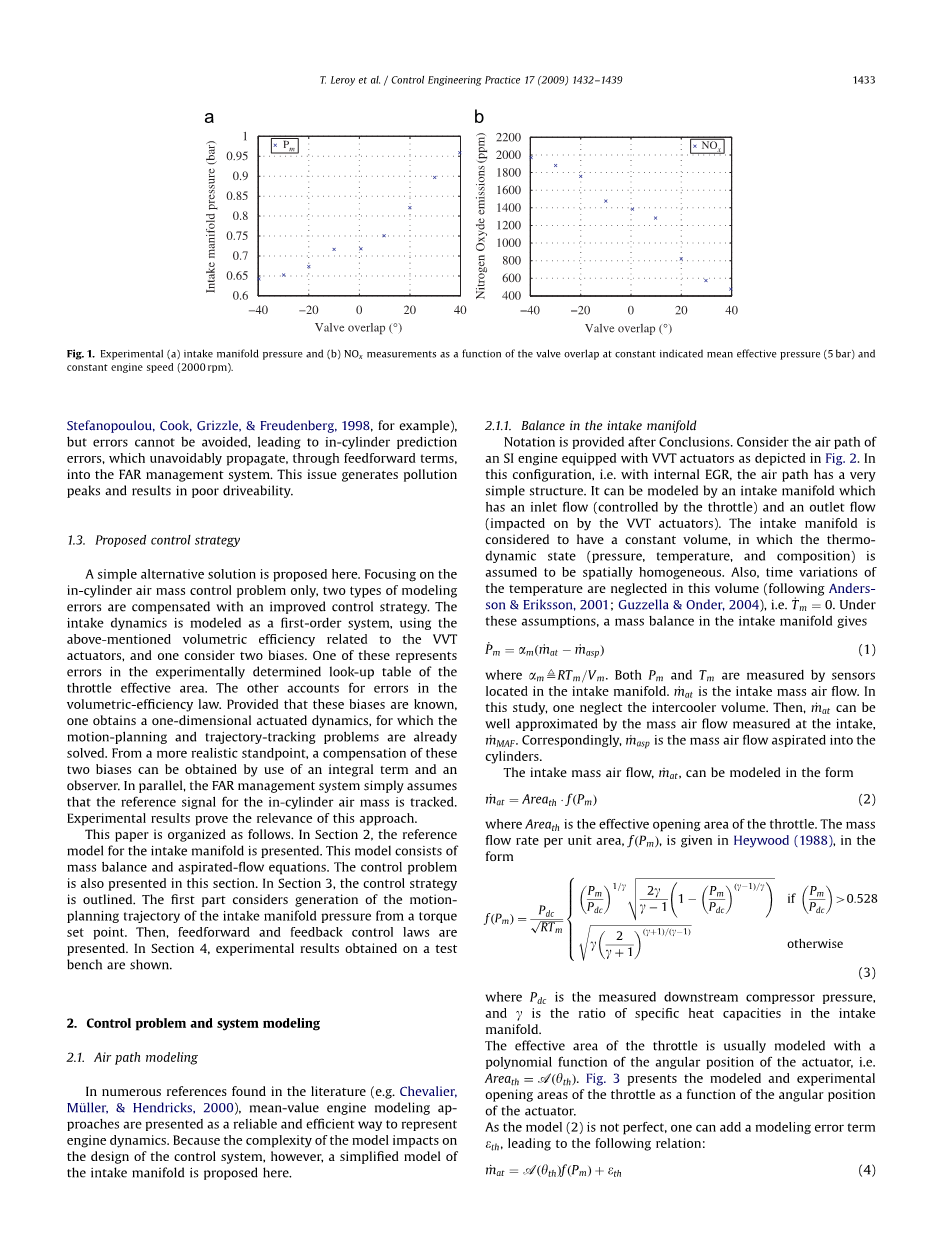 在SI发动机中配备VVT控制器,进入缸内的空气也取决于VVT控制器的位置。因此,VVT对从进气歧管进入气缸的空气体积的效率是有影响的。其影响可以参照(例如Colin, Chamaillard, Bloch, amp;Corde, 2007; Leroy, Chauvin, Le Berr, Duparchy, amp; Alix, 2008; Stefanopoulou, Cook, Grizzle, amp; Freudenberg, 1998),但是误差是无法避免的,这种误差导致缸内的情况预测误差,并且无法避免的通过前反馈系统进入管理系统。这个问题将会产生污染高峰和导致操纵性能下降。