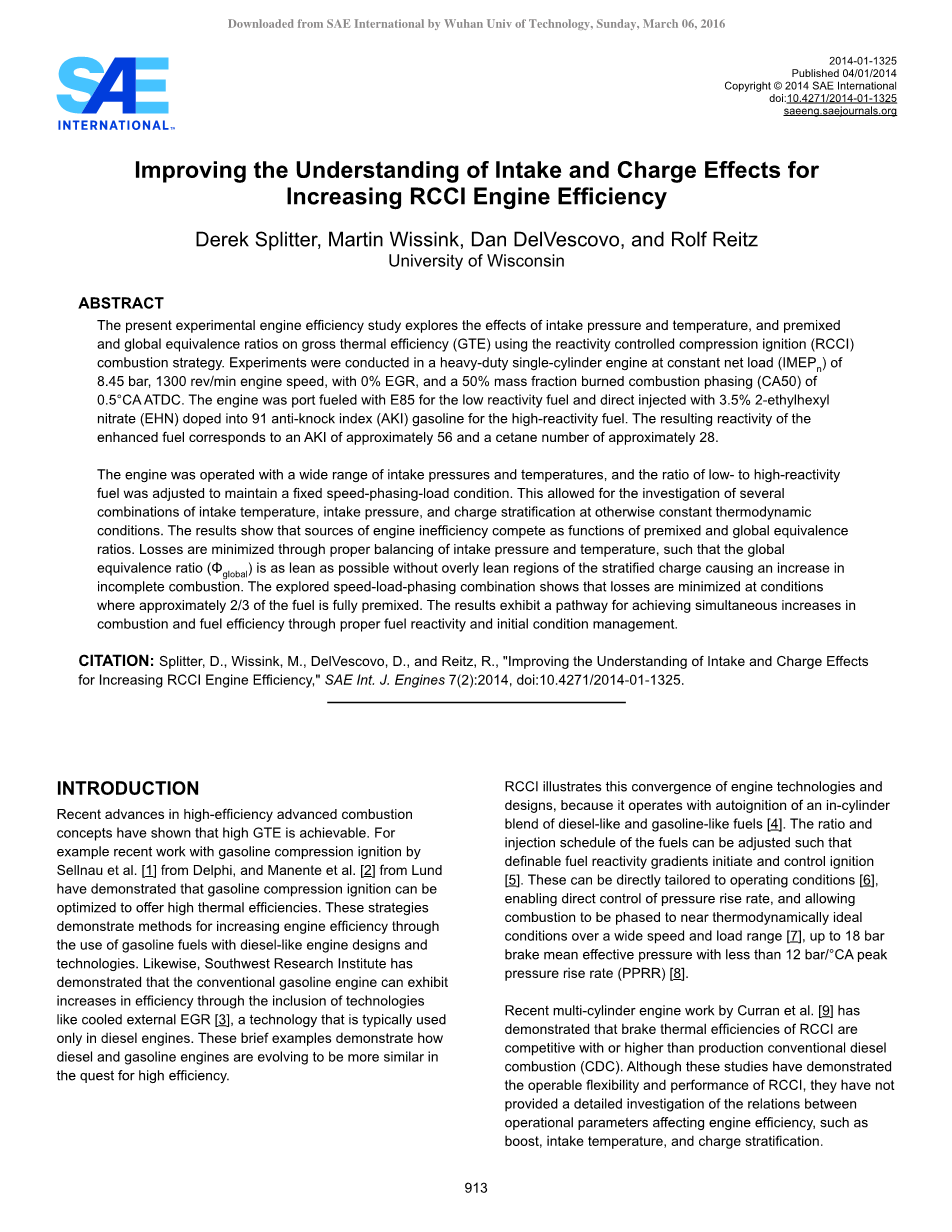 本次实验的发动机效率主要研究探讨进气压力和温度、预混合效果、使用低温预混合燃烧的燃烧策略的全部当量比总热效率。实验是用重型单缸柴油机在8.45巴,发动机转速为1300转/分,0%的废气再循环,还有在0.5°CA的上止点后是燃烧50%累计放热量的曲轴转角的恒定净负荷。发动机喷油端口使用E85的低反应性燃料和3.5%2-硝酸异辛酯掺杂到91号抗爆指数汽油的高反应燃料直喷。结果反应增强的燃料相当于对应的约56的抗爆指数和一个约28的十六烷值。发动机控制在一个范围的进气压力和温度,从低到高的反应性燃料的比率调整到保持在一个速度相位负载的工况。这允许进气温度,进气压力和进气分层在其他热力学条件相同下几种组合的研究。结果显示发动机低效率来源于预混合气和全部当量比的相对关系。通过损失进气压力和温度的适当平衡达到最小化,使得全部当量比尽可能稀薄而避免增加分层充气的过于稀薄区域的不完全燃烧。这个研究的速度负载相位组合显示在大约2/3的燃料是完全预混合燃料的条件下损失最小。结果证明实现同时增加燃烧和燃料效率的一个途径是通过调节适当的燃料反应性和初始条件管理。