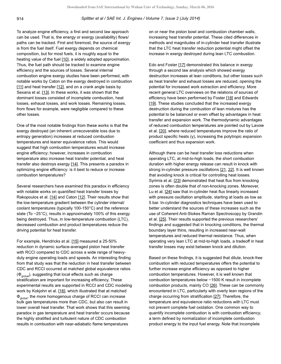 一些研究人员Rakopoulos等人和Caton已经通过定量的传热损失研究这个关于效率的矛盾。他们的研究结果显示低温梯度在缸内冷却剂温度(通常为100-150℃)与参考标准(到25℃)间,导致㶲大约100%被破坏。因此,在低温燃烧中,降低燃烧及其产物的温度可减少热传递的驱动势。