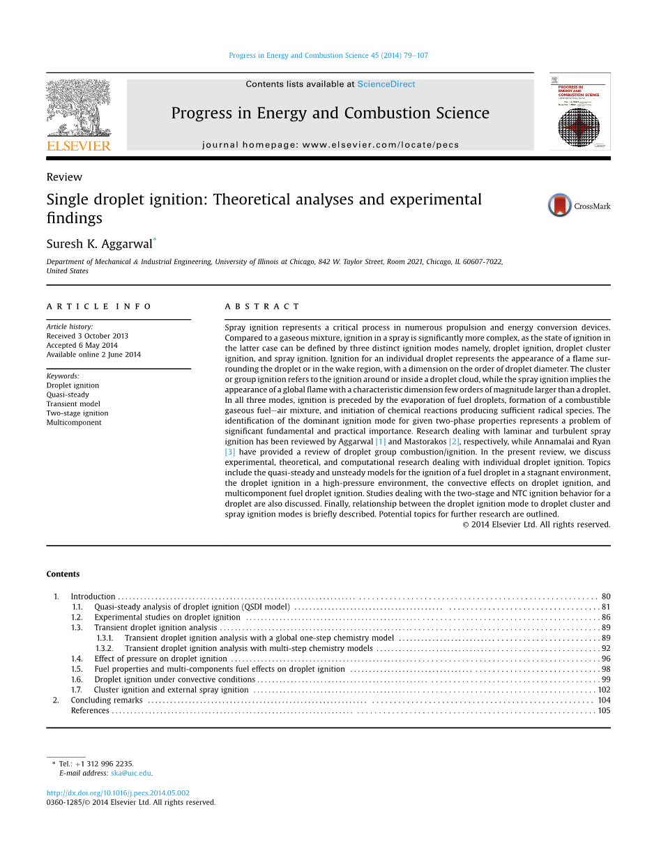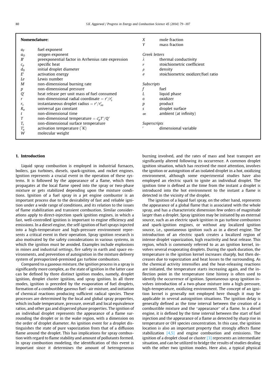 与气态混合物相比,喷雾中的着火过程明显更加复杂,因为后者的着火状态可以被定义成三种不同的着火模式,分别称为:液滴着火、液滴群着火和喷雾着火。在所有的三种模式中,着火之前都会发生燃油液滴的蒸发、可燃气态燃油-空气混合物(可燃混合气)的形成以及生成足够自由基的化学反应的启动等现象。这些过程取决于局部及全局喷雾性质,这些性质包括温度、压力、全局和局部当量比,还取决于其他气体和分散相的特性。单液滴着火指的是在尾迹区内或者液滴周围产生火焰,其尺度与液滴直径在同一数量级上。液滴的着火事件使得液滴周围产生扩散火焰的情形明显区别于单纯蒸发时的情形。这对于喷雾燃烧的火焰稳定性以及污染物的形成有一定影响。在喷雾燃烧模型中,着火事件的识别是十分重要的,因为它决定了相关的非均质燃烧。并且在着火之后,传热传质速率也会发生明显的变化。普通的液滴着火情形备受关注,因为它包含了在一个高温氧化环境中的单液滴着火或自燃的情形。而在一些实验研究中,也引入了火花塞来引燃单液滴。着火时间定义为:从液滴被引入高温环境的瞬时到在液滴附近探测到火焰的瞬间所经过的时间。