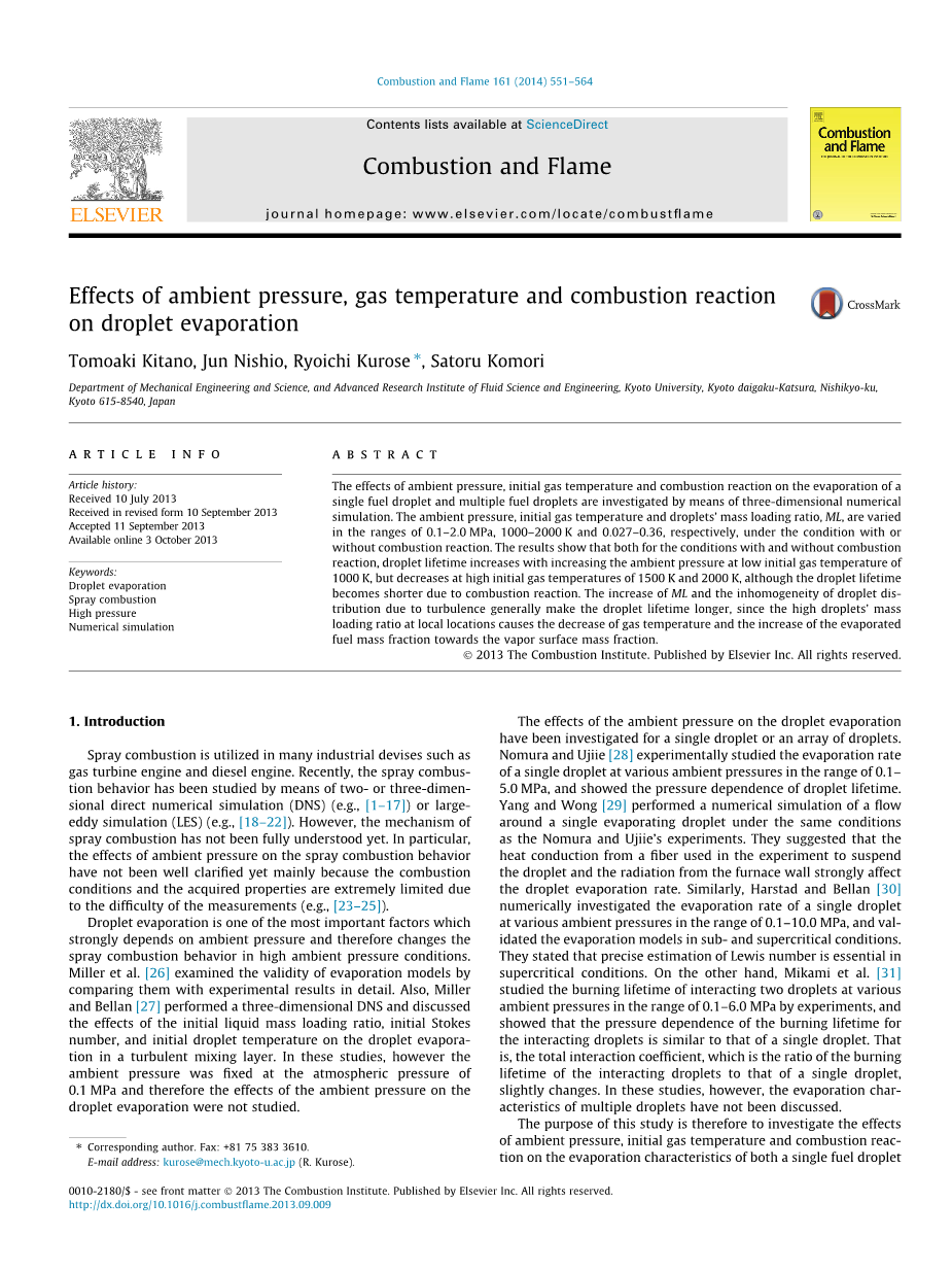 喷雾燃烧被利用在许多的工业装置中,比如燃气涡轮机和柴油机。最近,喷雾燃烧通过两维或三维直接数值模拟(DNS)(如[1–17])或大涡流数值模拟(LES)(如[18–22])的方法进行研究。然而,我们对喷雾燃烧的机理尚未完全了解。特别是由于测量方面的困难,燃烧条件和获得的属性是非常有限的,使得环境压力对喷雾燃烧行为的影响还不能被很好地阐明(如[23–25])。液滴蒸发是决定环境压力的最重要的影响因素之一,因此改变了在高环境压力条件下的喷雾燃烧行为。Miller et al. [26] 通过和实验结果进行详细的比较研究了蒸发模型的有效性。同时,Miller和Bellan [27]做个一个三维直接数值模拟的实验并且讨论了在湍流混合层中液体质量负载率、初始斯托克斯数字和初始液滴温度对液滴蒸发的影响。然而在这些研究中,大气压力下的环境压力是固定的0.1 MPa,因此环境压力对液滴蒸发的影响没有研究。