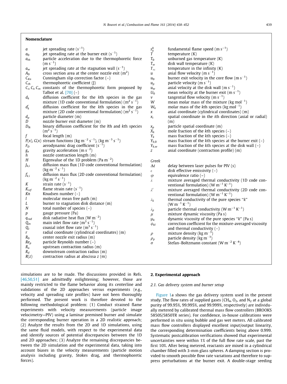 在前述的调查中,Frouzakis等的DNS研究 [46]提供了一维的方式相对于二维的一项所述的相对的喷射氢 - 空气扩散火焰的情况下的一个独特的评估 [46]。表明,如果在喷嘴出口的速度分布是不均匀的一维方法可能是不准确的。类似的结论,最近,Mittal和他的同事的DNS研究了逆流预混甲烷/空气火焰[50]。而速度分布均匀性的确是重要的,在滞止火焰实验的一个问题中,Sone的博士论文[51]表明,如果是要作出准确的一维模拟,相关的径向压力分布的假设值得特别注意。文献[ 46,50,51 ]提供的讨论,给予很大的启发;然而,那些主要局限于沿中心线和验证的二维方法与试验火焰的行为(例如,速度和传播速度剖面)没有被彻底执行。因此,目前的工作是专门的以下方法问题:(1)进行使用层流预混燃烧器的火焰实验传播速度测量(粒子图像测速)和进行模拟相应的真实二维燃烧器模拟;(2)从分析二维和一维的模拟结果,使用相同的流体模型中,相对于该实验数据和识别一维和二维方法之间的潜在差异的来源;(3)分析二维仿真和实验数据之间的差异,考虑速度测量偏差(粒子运动的分析,包括重力,斯托克斯阻力,和热泳力)。