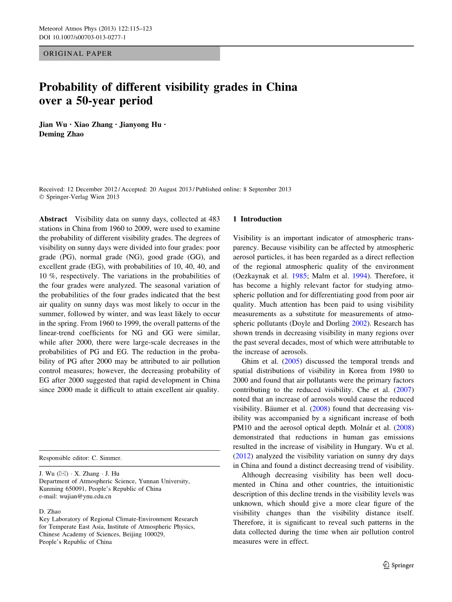 摘要:在中国483个台站采集的1960年到2009年晴天能见度数据被用来检查不同能见度等级的概率。晴天能见度分为四个等级:不良等级(PG),正常等级(NG),良好等级(GG)和优良等级(EG),概率分别为10%,40%,40%和10%。经过对四个等级概率变化的分析得到,四个等级的概率的季节性变化表明晴天最好的空气质量最有可能发生在中国夏季,其次是冬季,最不可能在春季发生。从1960年到1999年,NG和GG的线性趋势系数的总体模式是相似的,而在2000年以后,PG和EG的概率大幅下降。 2000年后PG的概率降低可归因于空气污染控制措施;然而,2000年以后EG的下降概率表明2000年以来中国的快速发展使得难以获得优异的空气质量。