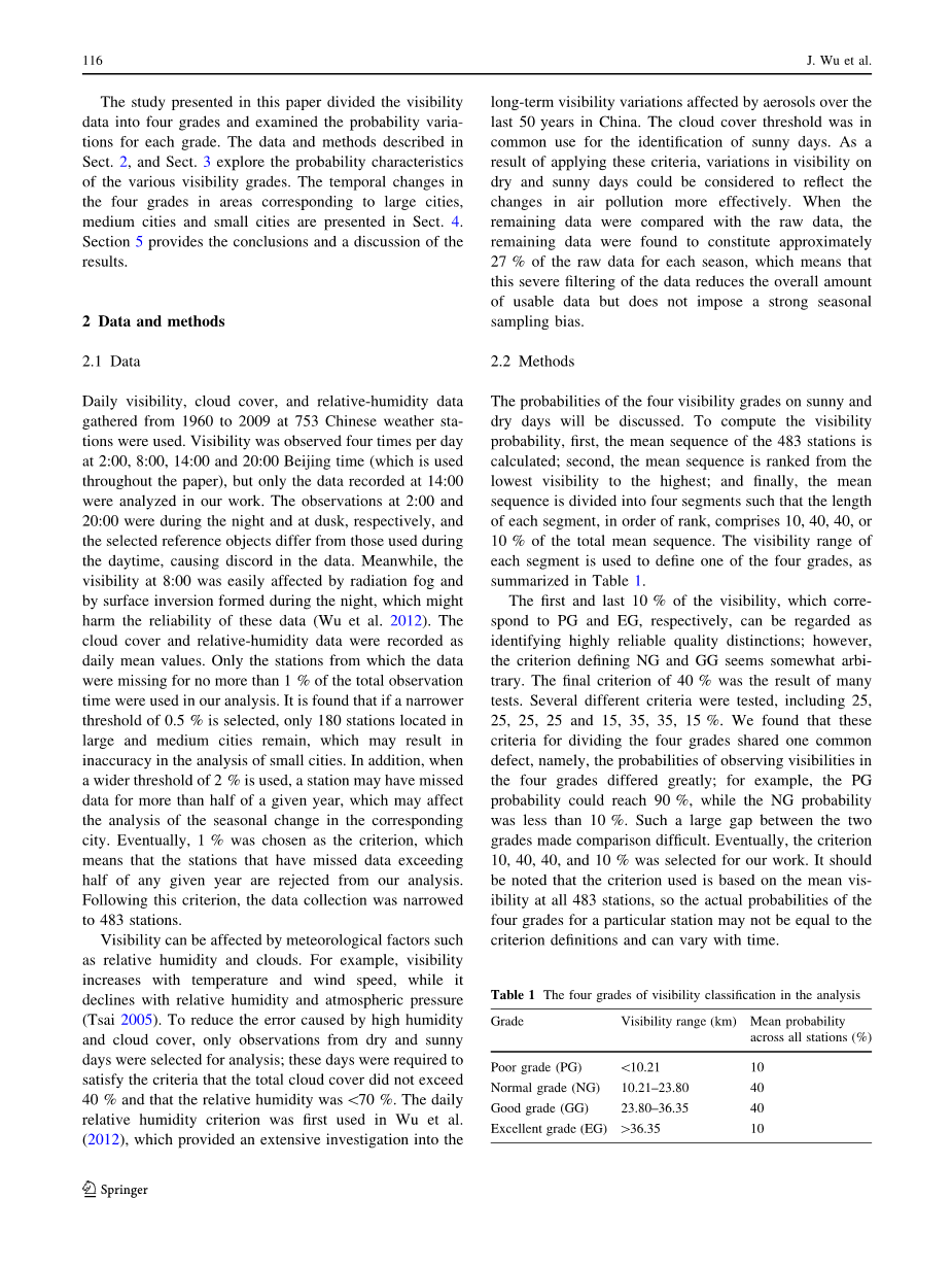 本文提出的研究将能见度数据分为四个等级,并检查每个等级的概率变化。 数据和方法在第2部分中描述,第3部分探索各种能见度等级的概率特征,第4部分介绍了大城市,中等城市和小城市相应地区四个等级的时间变化。 第5部分得出了结论和对结果的讨论。