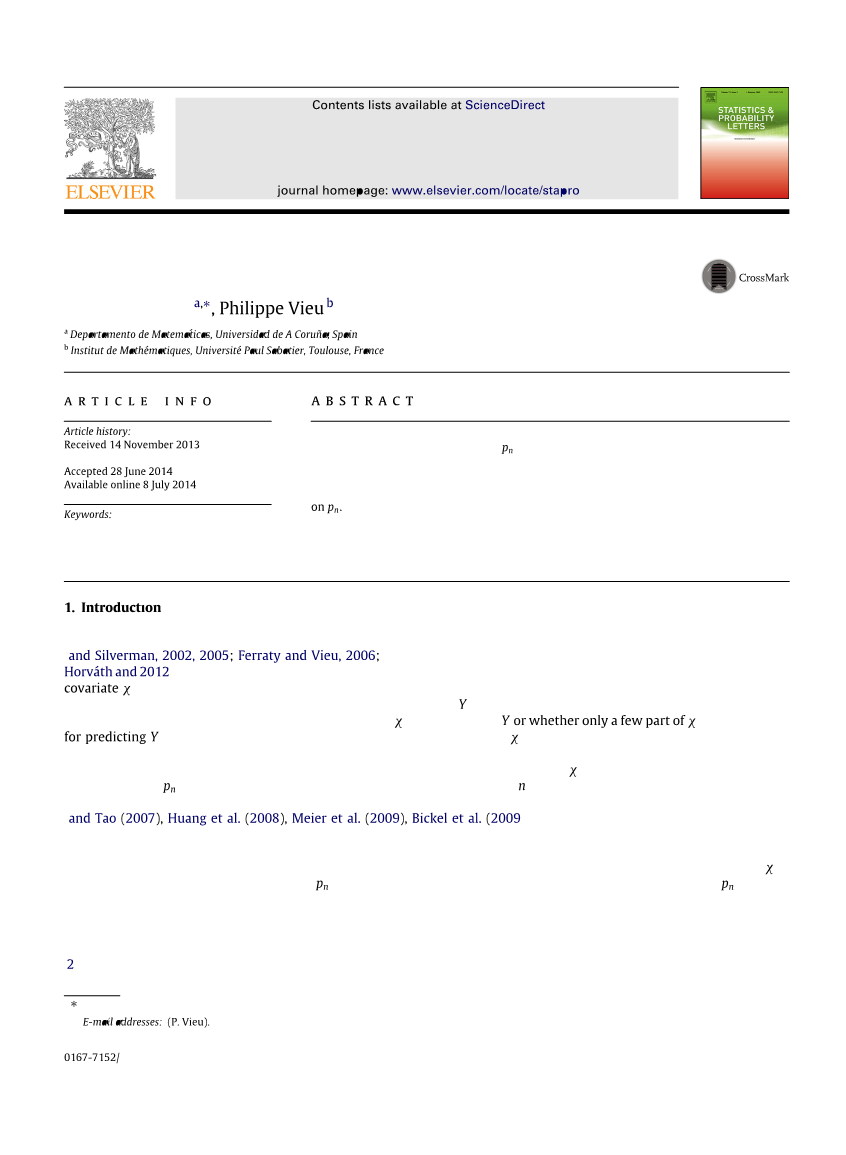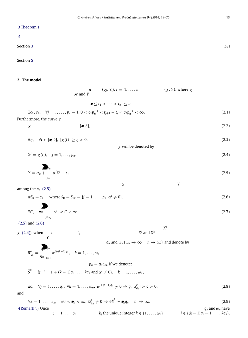 本文提出了一种普适的、可以迎合多种估计与不同变量选择方法的模型。文章组织如下。本文所提出模型在第二节中细谈,而所谓的分区变量选择方法(PVS)将在第三节中谈到。本节阐述我们的主要结果(定理1),并在其中对PVS方法的渐近性质进行了描述。值得注意的是,本节是以普适的方式编写的,没有指定任何类型的参数估计模型。之后,第四节会讨论PVS方法是如何应用到众多不同的估计方法中(最为出名的有惩罚最小二乘估计和极大似然估计),并且阐述了第三节中所提到的渐近性为何比其他没有考虑此问题特异性的变量选择方法更引人注目(无论是在收敛速度还是在条件下计算)。第五节使用来自于计量化学的曲线数据,通过优等有限样本抽样分析展示出的理论优势。该例子展现了PVS方法优于传统的未整合连续型变量方法之处,具体体现在提高预测能力与降低计算成本两处。