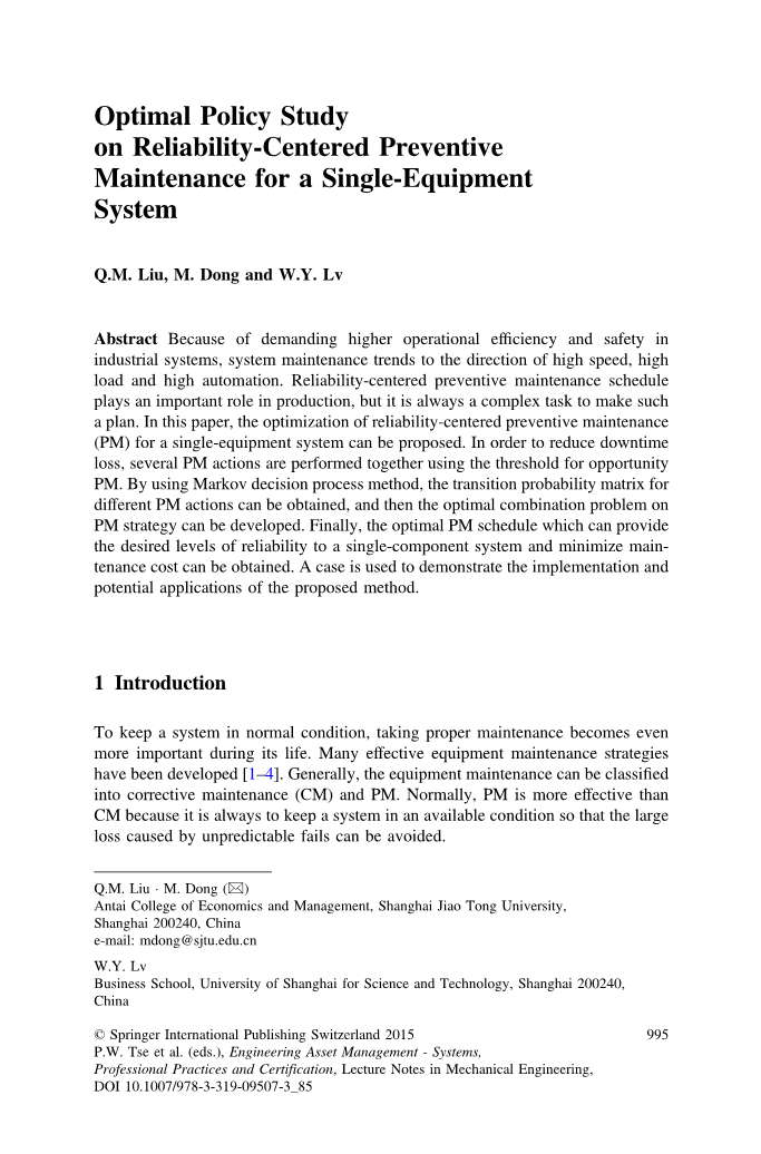根据定义的行动,调度的PM维护时间和系统的成本会影响所采取的行动的内容。考虑到PM的时间,PM的政策可以分为两种类型,定期PM和非定期PM。在本文中,对于一个单一的设备系统,可以明显减少停机损失以及它的有效性,可以促进它的可靠性,如果可以设置或维持在某个水平。可靠性和维护成本采用的标准作为调度维护行动。因此,PM下的可靠性。每个阶段采取不同的行动。考虑到不同的维护行动和可靠性的维护模型,并提出了以可靠性为中心的PM策略。其目的不仅在于维持系统寿命到预期寿命,而且是通过可靠性优化获得系统的最大效益。通过案例研究,结果表明,维护认为一个以上的行动比单一采取行动是更大的优势。