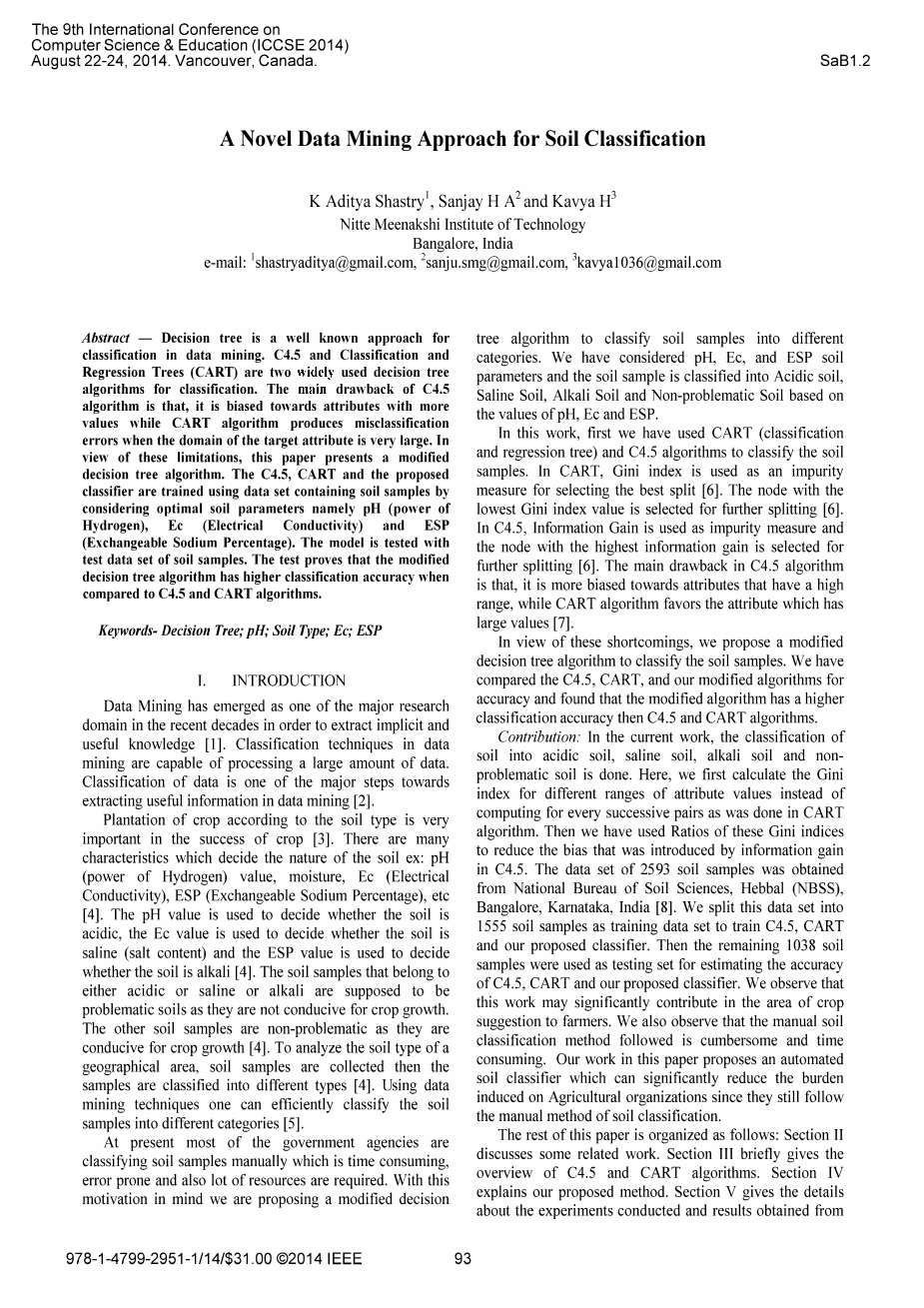 贡献:在现有工作中,将土壤分为酸性土、盐渍土、碱土和无问题土。在这里,我们首先计算不同属性值范围的基尼指数,而不是像CART算法那样计算每对连续的基尼指数,然后我们使用这些基尼指数的比值来减少C4.5中信息增益带来的偏差。这份包含2593份土壤样本的数据集来自印度卡纳塔克邦,班加罗尔的国家土壤科学局(NBSS)。本文将这些数据集分成1555个土壤样本作为训练数据集,用于训练C4.5、CART和我们提出的分类器。然后将剩下的1038个土壤样本作为测试集,对C4.5、CART和提出的分类器进行了精度评估。观察到,这项工作可能在向农民提供作物建议方面作出重大贡献。我们还发现,所采用的人工土壤分类方法既繁琐又耗时。本文提出了一种自动土壤分类器,它能有效地减轻农业组织由于仍然采用人工土壤分类方法而带来的负担。