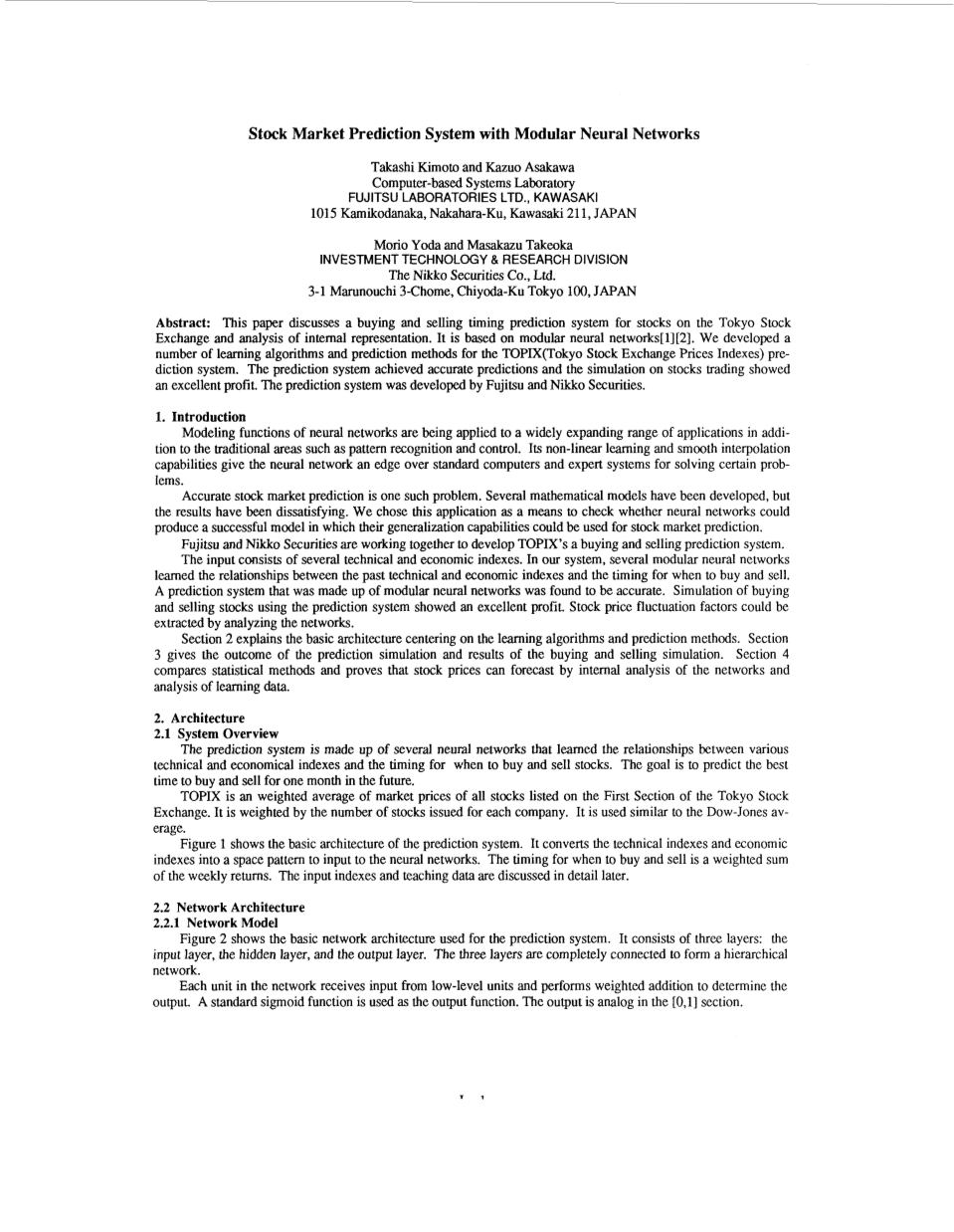 第二部分以学习算法和预测方法为核心,阐述了系统的基本架构。第三节给出了预测仿真的结果和买卖仿真的结果。第四节对统计方法进行了比较,证明股票价格可以通过网络内部分析和学习数据分析进行预测。