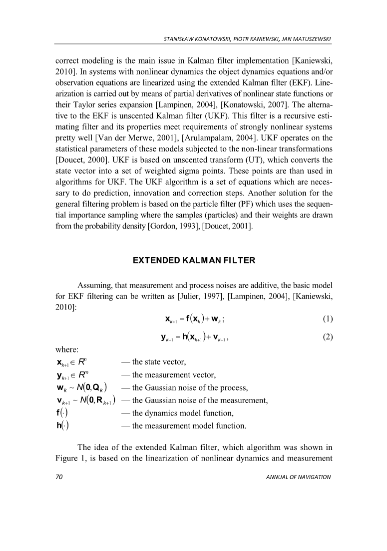 定位导航系统的滤波算法基于非线性状态方程和测量方程。它们在离散时间内工作。卡尔曼滤波器允许根据第k-1步的测量值来估计第k步中对象的误差或状态。卡尔曼滤波器使用对象(系统)的动态信息。系统动力学知识及其正确建模是卡尔曼滤波实现中的主要问题[Kaniewski, 2010]。在非线性动力学系统中,利用扩展卡尔曼滤波器(EKF)对目标动力学方程和/或观测方程进行线性化。线性化是通过非线性状态函数的偏导数或它们的泰勒级数展开来实现的[Lampinen, 2004], [Konatowski, 2007]。EKF的替代品是无味卡尔曼滤波器(UKF)。该滤波器是一种递归估计滤波器,其性能较好地满足强非线性系统的要求[Van der Merwe, 2001], [Arulampalam, 2004]。UKF对这些模型的统计参数进行非线性转换操作[Doucet, 2000]。UKF基于无嗅变换(UT),它将状态向量转换为一组加权的sigma点。这些点比在UKF算法中使用的要多。UKF算法是一组需要进行预测、创新和修正步骤的方程组。一般滤波问题的另一种解决方法是基于粒子滤波(PF),它使用顺序重要性抽样,其中样本(粒子)及其权重来自概率密度[Gordon, 1993], [Doucet, 2001]。