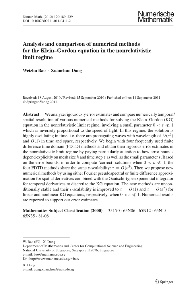 然而,在非相对论极限区,即当0lt;εlt;lt;1或光速达到无穷远时,KG方程(1.1)的分析和有效计算是数学上相当复杂的问题。分析困难主要是由于当ε→0时,E(T)在(1.2)中变得无界。最近,Machihara等人,[32]研究了能量空间中的这种极限,Masmoudi和Nakanishi[33]在能量空间的强拓扑中分析了这种极限。关于这方面最近取得的进展,我们参考[35,36,51]。结果表明,当0lt;εlt;lt;1时,解分别在时间和空间中传播波长为O(εsup2;)和O(1)的波。另一方面,这种时间上的高度振荡性提供了严重的数值负担,使得在非相对论性极限状态下的计算非常困难。据我们所知,到目前为止,在这种情况下,关于kg方程的数值计算的结果很少。