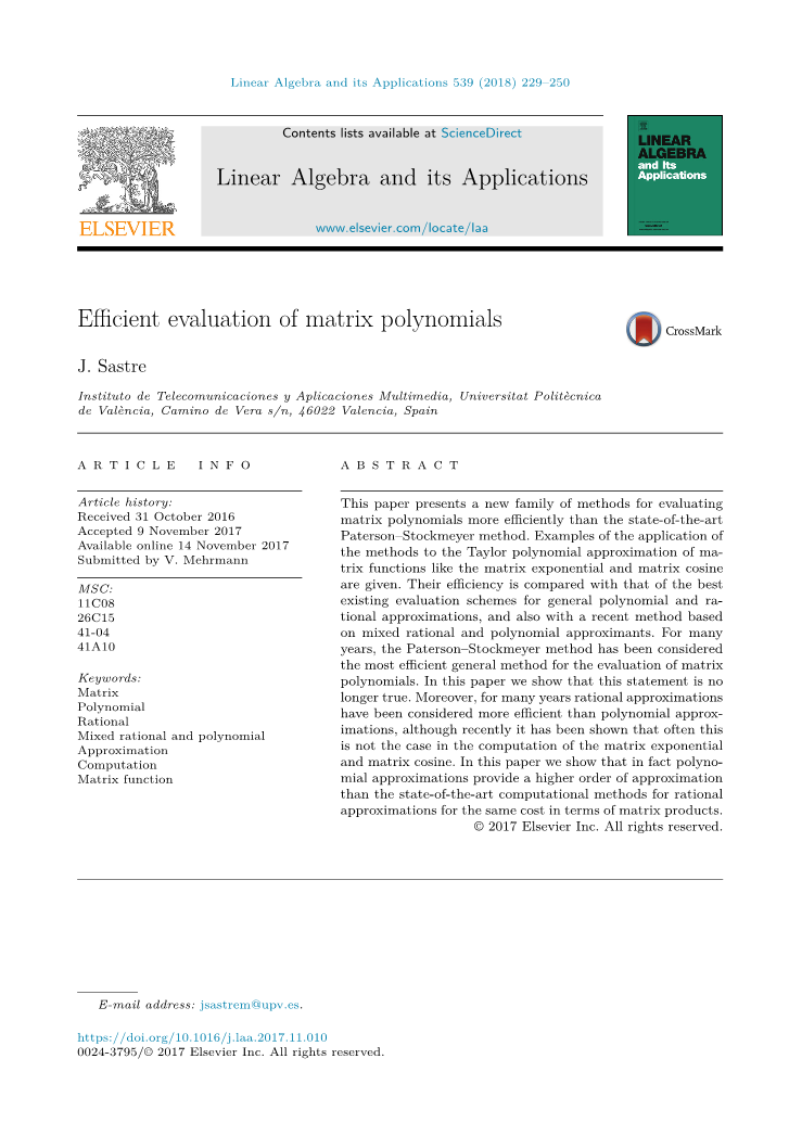 abstract:This paper presents a new family of methods for evaluating matrix polynomials more efficiently than the state-of-the-art Paterson–Stockmeyer method. Examples of the application of the methods to the Taylor polynomial approximation of ma- trix functions like the matrix exponential and matrix cosine are given. Their efficiency is compared with that of the best existing evaluation schemes for general polynomial and ra- tional approximations, and also with a recent method based on mixed rational and polynomial approximants. For many years, the Paterson–Stockmeyer method has been considered the most efficient general method for the evaluation of matrix polynomials. In this paper we show that this statement is no longer true. Moreover, for many years rational approximations have been considered more efficient than polynomial approx- imations, although recently it has been shown that often this is not the case in the computation of the matrix exponential and matrix cosine. In this paper we show that in fact polyno- mial approximations provide a higher order of approximation than the state-of-the-art computational methods for rational approximations for the same cost in terms of matrix products.