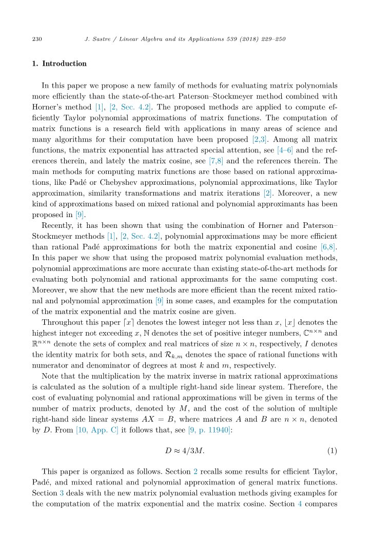 在本文中,我们提出了一种新的计算矩阵多项式的方法,比采用Horner方法[1], [2, Sec. 4.2]的最先进的Paterson-Stockmeyer方法更有效。我们提出的这个方法可用于高效地计算矩阵函数的泰勒多项式近似。矩阵函数的计算在许多科学区域都有应用,且已有许多算法被提出[2,3]。在所有的矩阵函数中,矩阵指数已引起了特别的关注,具体参见[4-6]及其中的参考文献;还有最近关于矩阵余弦的内容,参见[7,8]及其中的参考文献。计算矩阵函数主要运用如或Chebyshev近似,多项式近似如Taylor近似,相似变换和矩阵迭代[2] 这样基于有理近似的方法。此外,[9]中提出了一种基于混合有理和多项式近似的新近似。