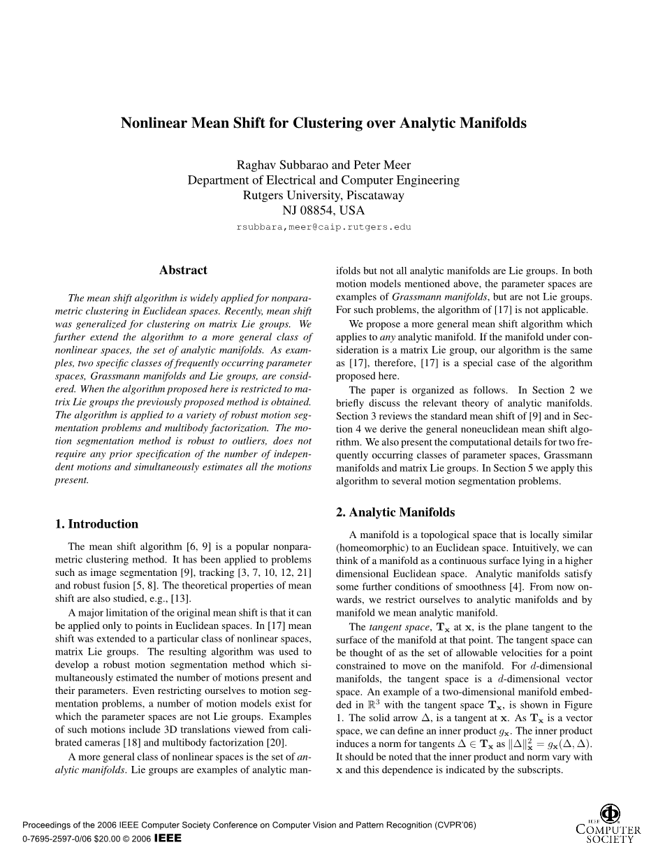 在欧几里德空间中,Meanshift算法被广泛应用于无参聚类方法。最近,meanshift算法逐渐被推广到李群矩阵中。我们又进一步把该算法拓展到更一般的非线性空间中,一个解析流形的集合。举个例子,在两个特定的频繁发生的参数空间中,格拉斯曼集合和李群代数会被考虑。当该算法被限制在李群矩阵中时,就会得到早前提出的方法。该算法被应用于各种运动分割问题和多元因数分解中。运动分割方法对离群点具有鲁棒性,对独立运动的数量和当前所有动作的估计不做任何事先规范。