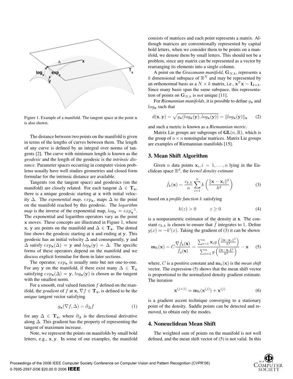 流形上的点的加权和没有得到很好的定义,并且(5)的平均移位向量是无效的。在本节中,我们将得到均值漂移向量作为切向量加权和。由于切空间是向量空间,因此,正切的加权平均是可以得到的,而且可以用来更新模估计。此方法对任何解析流形都是有效的。