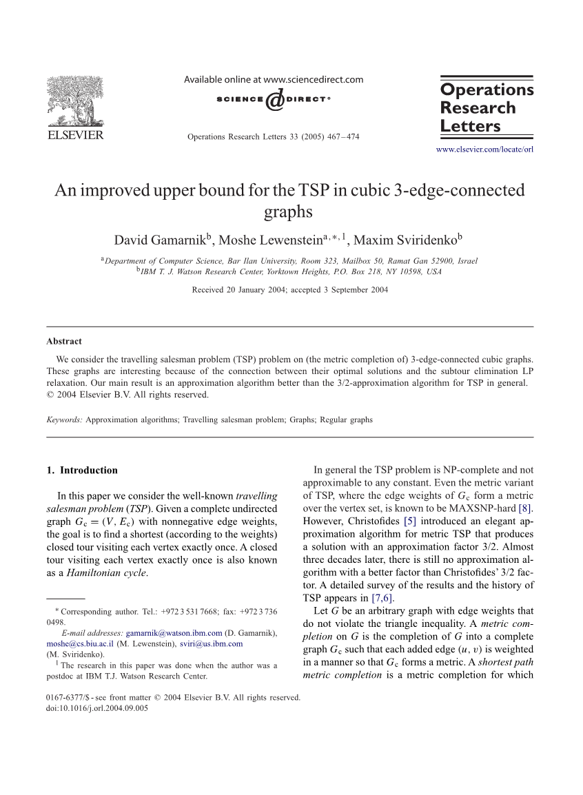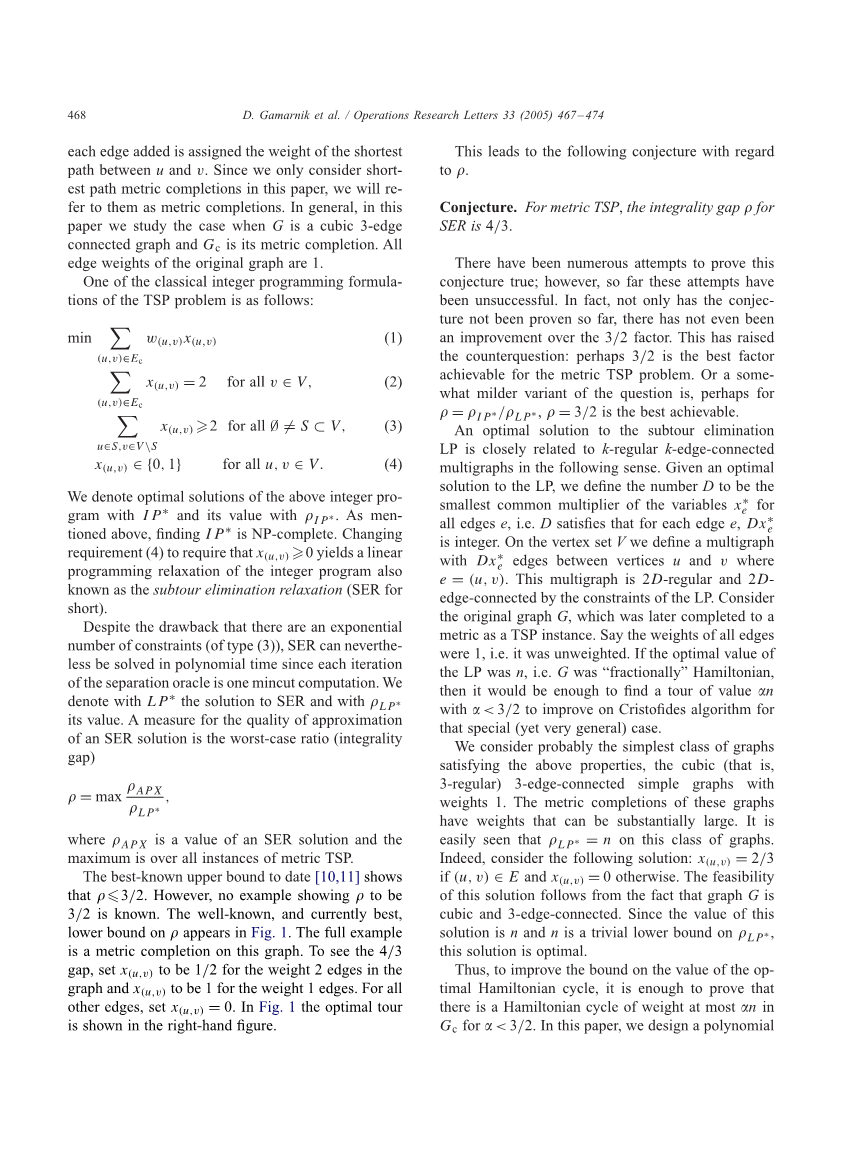 我们认为旅行商问题(TSP)中的(度量完备的)3边连通三正则图是有趣的,因为他们的最优解和子回路消除LP松弛之间的联系。我们的主要结论是找出一个比3 / 2近似算法更好的求解一般性tsp问题的近似算法。