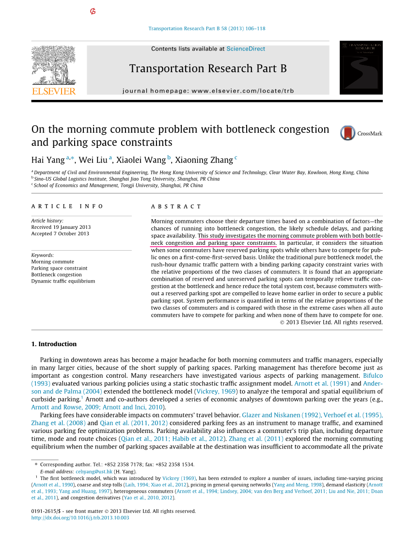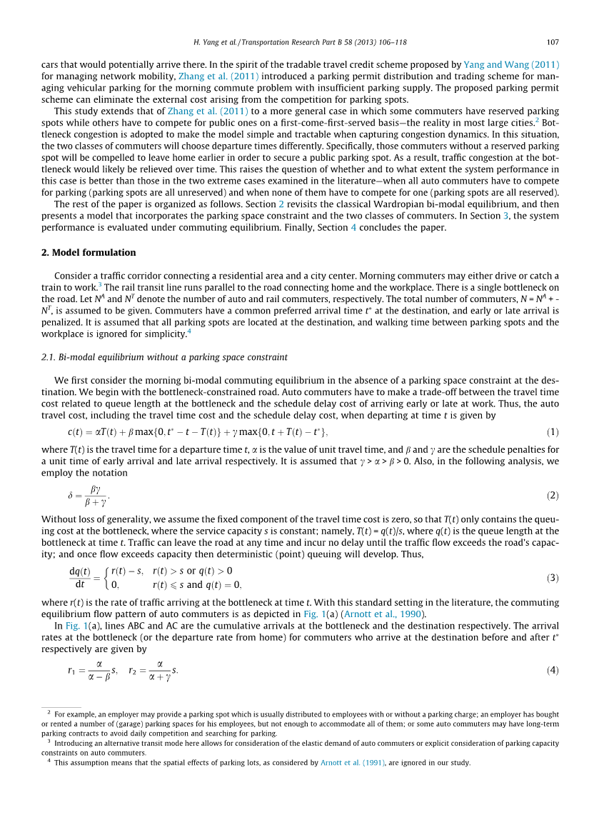 停车费对上班者的出行行为有很大影响, Glazer与Niskanen (1992), Verhoef等人(1995), Zhang等人(2008)以及Qian等人(2011, 2012)将停车费作为管理交通的工具, 研究各种停车费优化问题. 泊车情况也影响上班者的出行计划, 包括出发时间、模式和路线选择(Qian等人, 2011; Habib等人, 2012), Zhang等人(2011)研究了目的地可用停车位数量不足以容纳所有可能到达的私家车时的早晨上班平衡, 本着Yang和Wang(2011)为管理网络移动性而提出的可交易旅行信用计划的精神, Zhang等人(2011)引入了一种停车许可证分配和交易计划, 用于管理车辆停车, 以解决停车供应不足的早晨上班问题, 所建议的泊车许可证计划, 可消除因争夺泊车位而引致的外部成本.