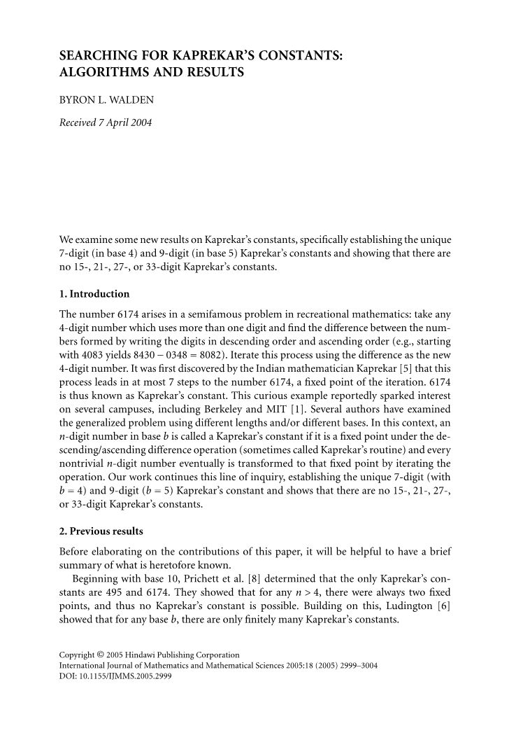 [8] G. D. Prichett,A. L.拉丁顿,和J. F.勒庞塔,所有十进制Kaprekar常数的测定,fibonacciquart.19(1981),1号,45–52.