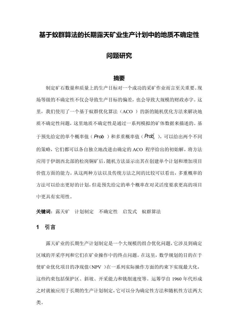 基于蚁群算法的长期露天矿业生产计划中的地质不确定性问题研究外文翻译资料 2023-03-08 20:10:26 英语原文共 10 页,剩余内容已隐藏,支付完成后下载完整资料 英语原文共 24 页,剩余内容已隐藏,支付完成后下载完整资料 资料编号:[145978],资料为PDF文档或Word文档,PDF文档可免费转换为Word 您需要先支付 30元 才能查看全部内容!立即支付 发小红书推广免费获取该资料资格。点击链接进入获取推广文案即可: Ai一键组稿 | 降AI率 | 降重复率 | 论文一键排版 PREVIOUS NEXT 您可能感兴趣的文章 非线性薛定谔方程的几种差分格式比较文献综述 基于多目标优化社团发现的比较研究文献综述 基于不同数据源的干旱监测比较研究开题报告 基于MATLAB/GUI的非线性方程求解开题报告 一类Hermitian矩阵行列式函数的极值问题文献综述 非线性Schr#246;dinger方程的一个显式Sine拟谱方法文献综述 学生兼职信息管理系统开发文献综述 基于图像的物体高度测量方法及实现开题报告 SNPP/VIIRS海洋叶绿素浓度产品的真实性检验文献综述 基于Landsat影像的南通双如地区土地利用变化监测与分析文献综述