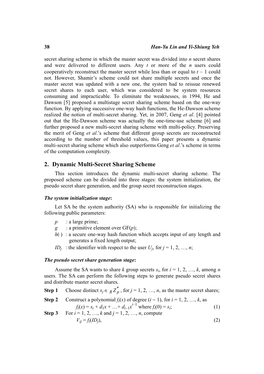 1979年,Shamir [13]把想法付诸实践,提出的(t,n)门限秘密分享计划,将主秘密分为n个秘密分享,并传递给不同的用户。任何t以上的n用户可以合作重建主秘密而小于或等于tminus;1不能。然而,Shamir 的计划不能分享多个秘密,一旦主秘密与一个新的更新,系统必须补发新的秘密份额每一个用户,它被认为是系统资源消耗和行不通的。消除弱点,在1994年,他和Dawson[5]提出了一种基于单向函数多级秘密共享方案。通过应用连续单向散列函数,He-Dawson方案实现多秘密共享的概念。然而,在2007年,Geng et al[4]指出,He-Dawson方案实际上是一次性方案[6],并进一步改进了一个新的多秘密共享方案。保留了Geng方案的优点,根据阈值的数量实现不同组的秘密重构,提出了一个动态的多秘密共享方案也优于Geng et al。”年代方案的计算复杂性。