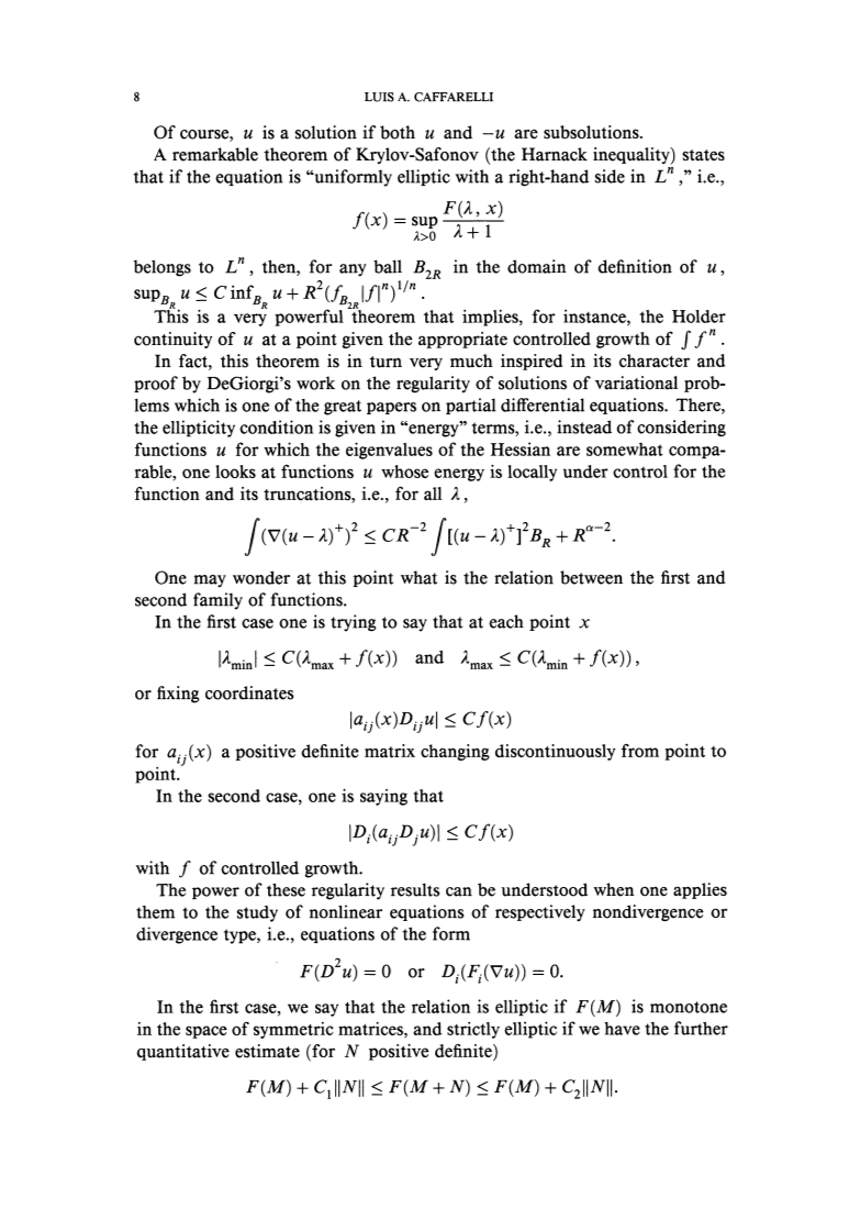 实际上,这个定理后来在它的特点上大受启发,而 De Giorgi关于解的正则性的变分问题的证明是偏微分方程领域最重要的论文之一,在该论文中,椭圆条件被给定为能量形式 考察函数(对于该函数和它的截断,能量是局部受控的),而不考虑Hessian矩阵的特征值是可比较的函数. 对于任何一个有