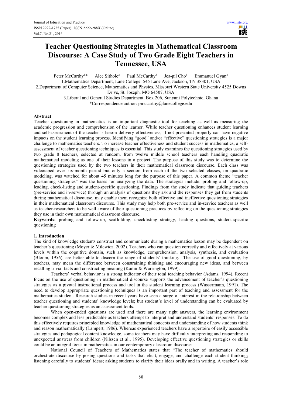Teacher questioning in mathematics is an important diagnostic tool for teaching as well as measuring the academic progression and comprehension of the learner. While teacher questioning enhances student learning and self-assessment of the teacherrsquo;s lesson delivery effectiveness, if not presented properly can have negative impacts on the student learning process. Identifying “good” and/or “effective” questioning strategies is a major challenge to mathematics teachers. To increase teacher effectiveness and student success in mathematics, a self- assessment of teacher questioning techniques is essential. This study examines the questioning strategies used by two grade 8 teachers, selected at random, from twelve middle school teachers each handling quadratic mathematical modeling as one of their lessons in a project. The purpose of this study was to determine the questioning strategies used by the two teachers in their mathematical classroom discourse. Each class was videotaped over six-month period but only a section from each of the two selected classes, on quadratic modeling, was watched for about 45 minutes long for the purpose of this paper. A common theme “teacher questioning strategies” was the bases for analyzing the data. The strategies include: probing and follow-up, leading, check-listing and student-specific questioning. Findings from the study indicate that guiding teachers (pre-service and in-service) through an analysis of questions they ask and the responses they get from students during mathematical discourse, may enable them recognize both effective and ineffective questioning strategies in their mathematical classroom discourse. This study may help both pr