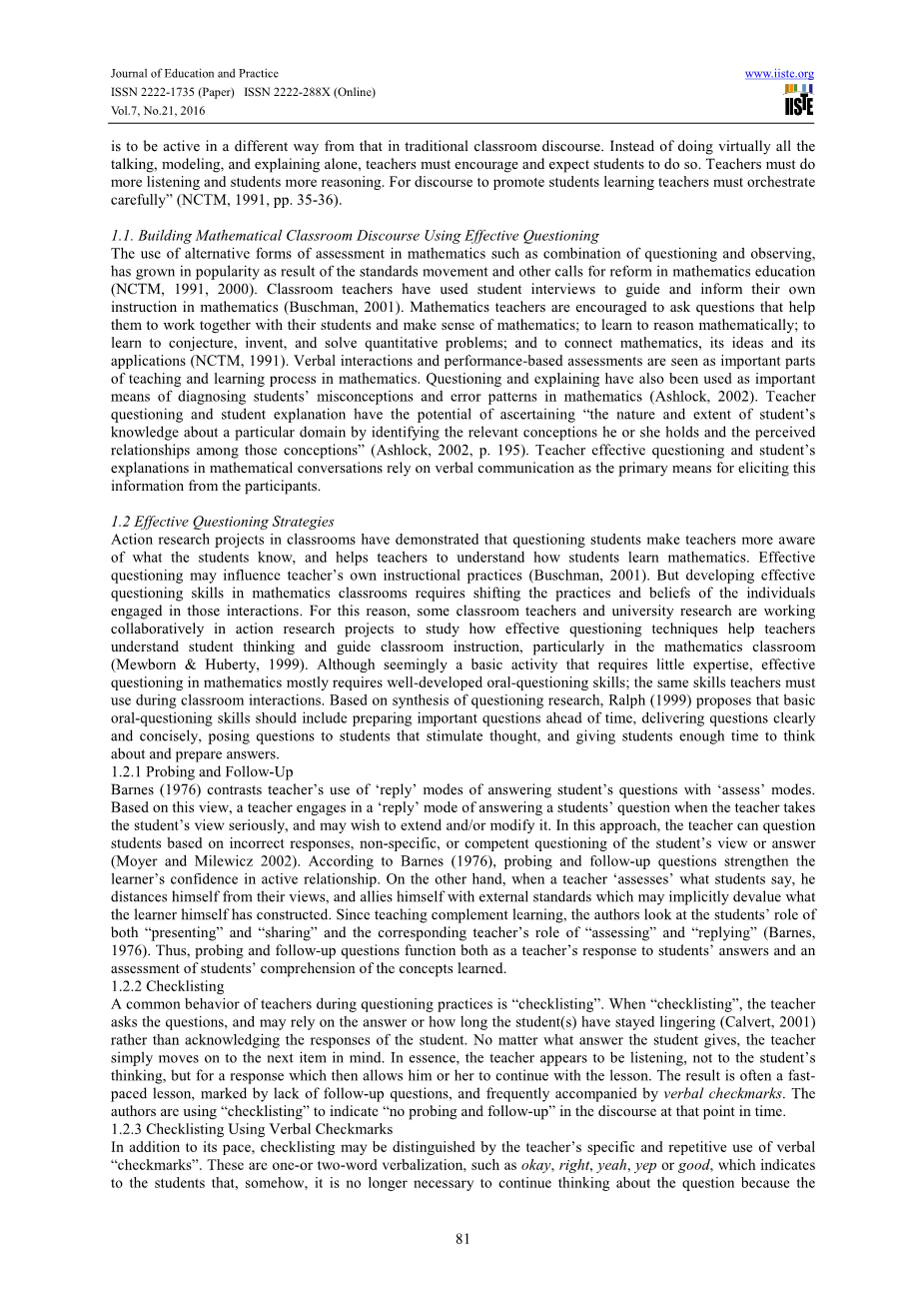 在提问实践过程中,教师的共同行为是“检验”。 当“检验”时,老师会询问问题,并且可能依赖于答案或学生停留的时间(Calvert,2001),而不是承认学生的回答。无论学生给出什么答案,老师只需简单地转到下一个项目去进行。 从本质上讲,老师似乎是在倾听,而不是学生的思考,而是为了让他或她继续上课的回应。 结果往往是一个快节奏的课程,其标志是缺乏后续问题,并且通常伴有口头检查标记。 作者正在使用“检验”来表示当时话语中的“没有探索和跟进”。