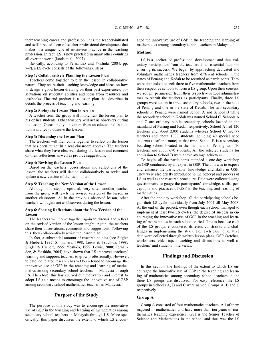 The purpose of this study was to encourage the innovative use of Geometerrsquo;s Sketchpad (GSP) in the teaching and learning of mathematics among secondary school teachers in Malaysia through Lesson Study (LS). Three LS groups were set up in three secondary schooLS. Qualitative data were collected through w