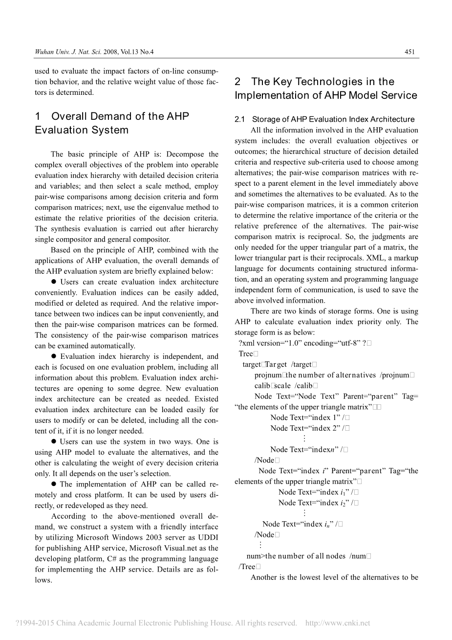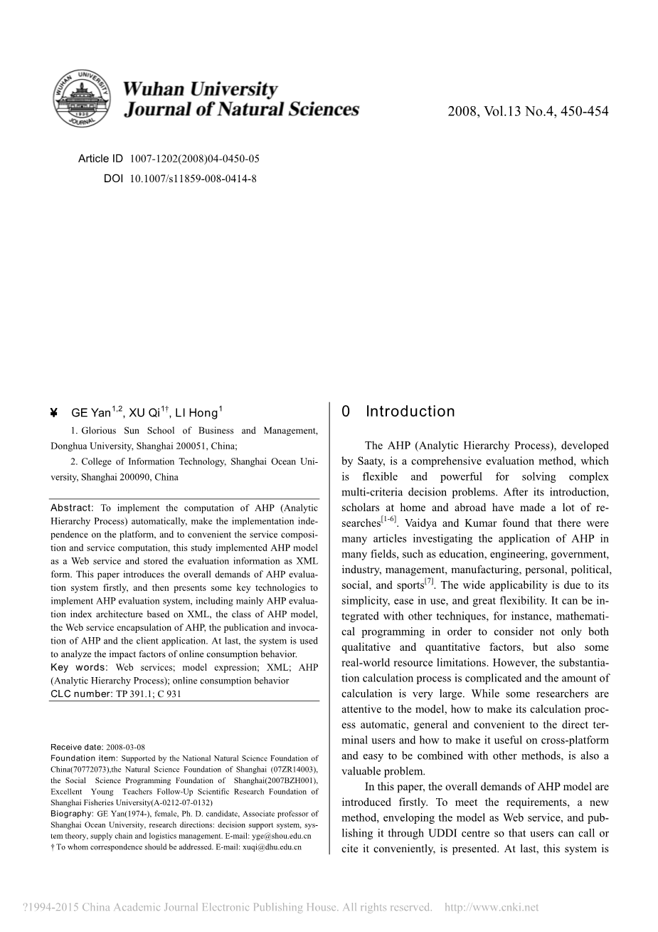 AHP(层次分析法),开发了通过评估,是一种综合评价方法,即是解决复杂灵活的和强大的多准则决策问题。在介绍,国内外学者已经做了大量研究[1-6]。Vaidya和库马尔发现许多文章对层次分析法中的应用许多领域,如教育,工程,政府,行业,管理,制造,个人,政治,社会,体育[7]。的广泛适用性是由于其简单,易于使用,和极大的灵活性。它可以集成与其他技术,例如,数学规划中不仅要考虑两个定性和定量的因素,但也有一些现实世界的资源限制。然而,证明计算过程复杂、计算数量是非常大的。虽然一些研究人员注意到模型中,如何使其计算过程自动的,一般的和方便的直接终端用户如何在跨平台的有用易于与其他方法相结合,也有价值的问题。在本文中,AHP模型的总体要求首先介绍了。为了满足要求,一个新的方法,包络模型为Web服务,并发布它通过UDDI注册中心,用户可以通过电话或引用它的方便,提出了。最后,本系统用于评估在线消费的影响因素行为,以及这些因素的相对权重值确定。