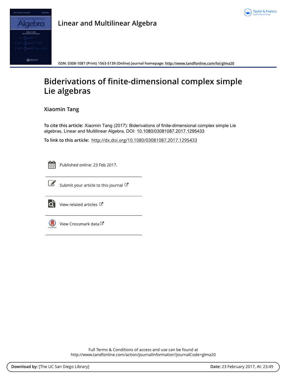 导子和广义导子是两个代数及其推广研究中非常重要的课题。近年来,双导子引起了很多作者的兴趣,见文献 [1-11]。Brescaron;ar等人文献[1]证明了交换素环上的所有双导子是内双导子,并确定了半素环的双导子。在文献[ 8 ]中引入了李代数的双导子的概念,Wang等人证明了Schrouml;dinger- Virasoro代数的反对称双导子是内双导子[7],Xia等人证明了具有反对称性的超双导子在超Virasoro代数是内双导子的 [9],Chen [3]指出了特征零域上的单广义Witt代数的每一个反对称双导子也是内双导子。在文[6]中,Han等人确定了W ( a,b )的所有反对称双导子并发现存在非内双导子。计算一些重要的李(超)代数的双导子可能是有用且有趣的,当然,我们应该首先考虑有限维复单李代数.事实上,Wang等人证明了有限维复单李代数的反对称双导子是内的[9],但关于一般双导子(不受反对称性限制)的问题仍然是不清楚的。我们将在本文中对此问题进行研究。