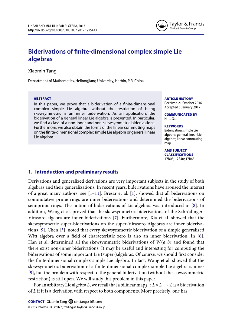 令。双线性映射将送至是的双导子,这被称的内双导子。众所周知,有限维复单李代数的每个导子都是内导子。这就带来了一个自然的问题:什么是有限维复单李代数的双导子?这个问题似乎已经被[8]所回答,即一个有限维复单李代数的每一个双导子是一个内双导子。下面的假设是[8]中的一个关键的引理(见[8]中的引理2.2)。