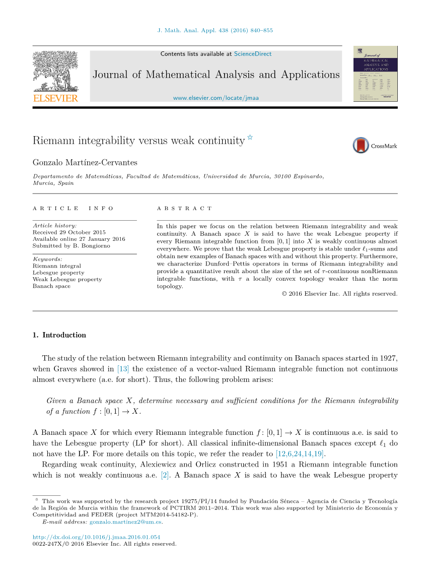 证明。设D = {}iisin;Gamma;是Xlowast;中具有|Gamma;| lt; cov(M)的稠密子集,并取f:[0,1]→x是黎曼可积函数。我们证明了f几乎处处是弱连续的。设Ei是f的不连续点的集合,对于每个iisin;Gamma;。由于每个函数f是黎曼可积的,每个Ei都是测度为0的闭集的可数并集。因此,E:= cup;iisin;Gamma;Ei测度为零,因为|Gamma;| lt; cov(M)。由引理2.1可知,E是f的弱不连续点的集合,因此f是几乎处处弱连续的。