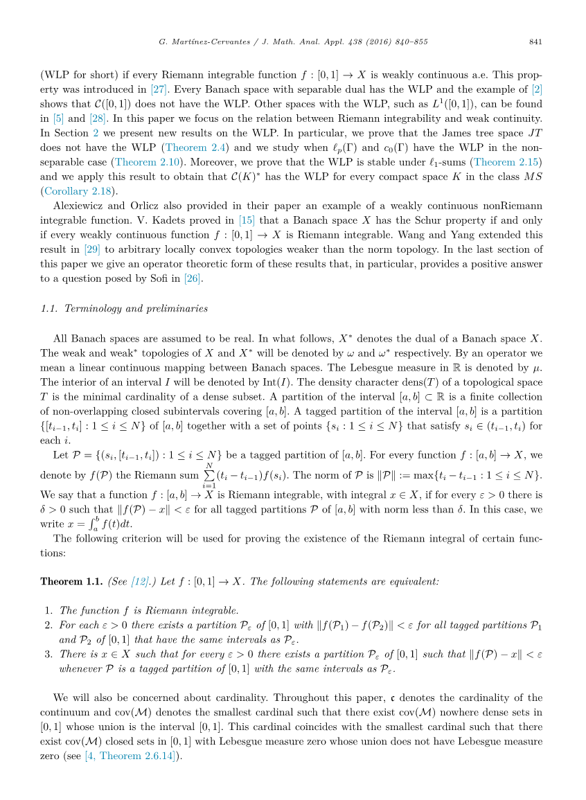 关于弱连续,Alexiewicz和Orlicz在1951年构造了一个黎曼可积函数,该函数不是几乎处处弱连续的,即[2]。如果每个黎曼可积函数f:[0,1]→X是几乎处处弱连续的,则巴拿赫空间X具有弱勒贝格性质(简称WLP)。每个具有可分离对偶的巴拿赫空间都有WLP,[2]的例子表明∁ ([0,1])没有WLP。带WLP的其他空间,如L1([0,1]),可以在[5]和[28]中找到。本文主要研究了黎曼可积与弱连续性的关系。在第2节中,我们介绍了关于WLP的新结果。特别地,我们证明了James树空间JT不具有WLP(定理2.4),并研究了在非可分离的情况下£p(Gamma;)和c0(Gamma;)何时具有WLP(定理2.10)。此外,我们证明了WLP在来£1全集下是稳定的(定理2.15),并应用这个结果得出∁ (K)lowast;对于类MS中的每个紧致空间K都具有WLP(推论2.18)
