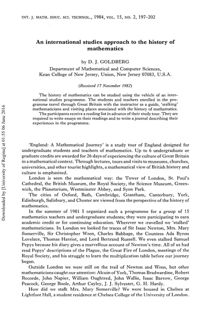 1981年夏天,我为15名数学教师和本科生组织了这样一个项目;他们为了获得学分或接受继续教育而参与项目。无论我们走到哪里,我们都在追寻数学家的踪迹。在伦敦,我们寻找艾萨克·牛顿爵士(Isaac Newton)、玛丽·萨默维尔夫人(Mary Somerville)、克里斯托弗·雷恩爵士(Christopher Wren)、查尔斯·巴贝奇(Charles Babbage)、艾达·拜伦·洛夫莱斯伯爵夫人(Ada Byron Lovelace)、托马斯·哈里奥特(Thomas Harriot)和伯特兰·罗素勋爵(Lord Bertrand Russell)的踪迹。我们甚至跟随塞缪尔·佩皮斯(Samuel Pepys)的踪迹,因为他的日记描述了奇迹般的牛顿时代。我们在研学开始之前,都读到了佩皮斯关于瘟疫、伦敦大火、皇家学会会议以及他努力学习乘法表的描述。