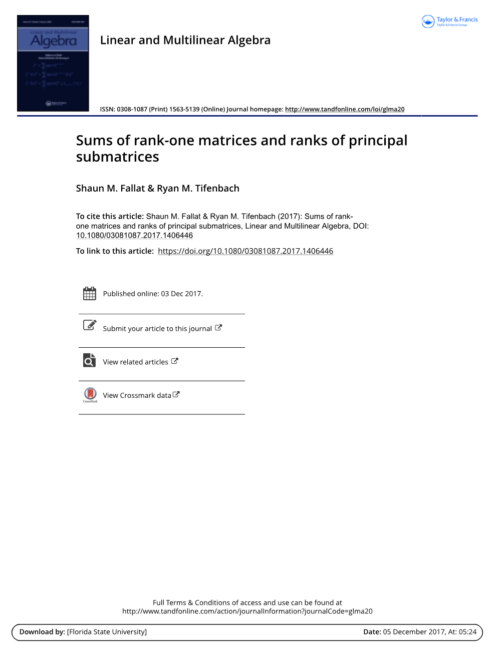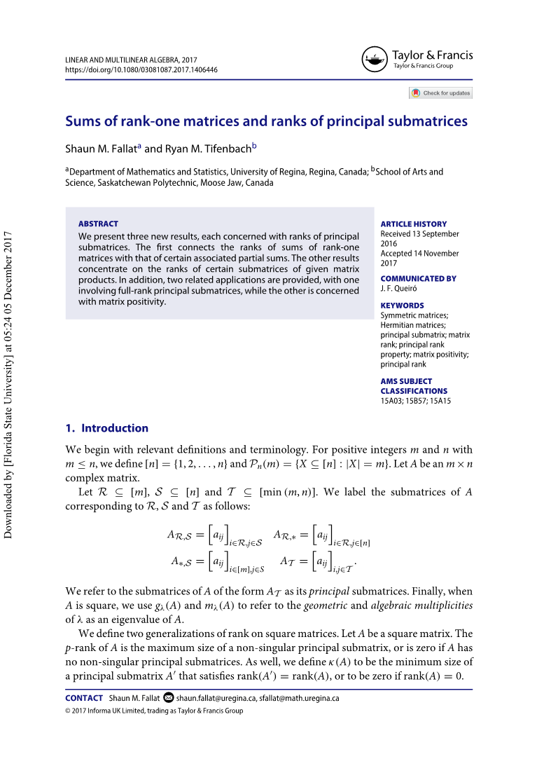 [1]Fallat Shaun M.,Tifenbach Ryan M.. 秩一矩阵的总和与主子矩阵的秩[J]. 线性和多重线性代数,2021,69(1)。