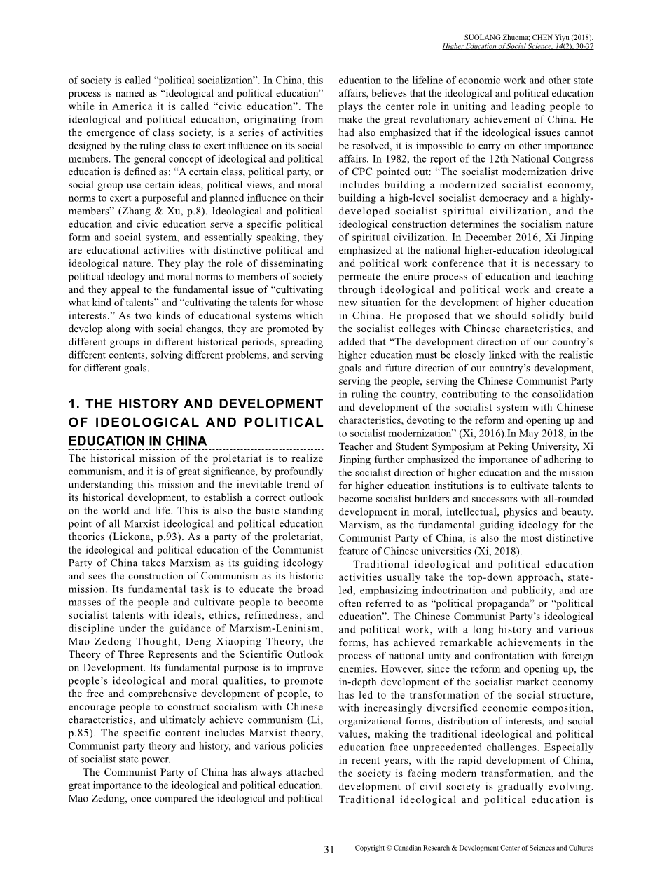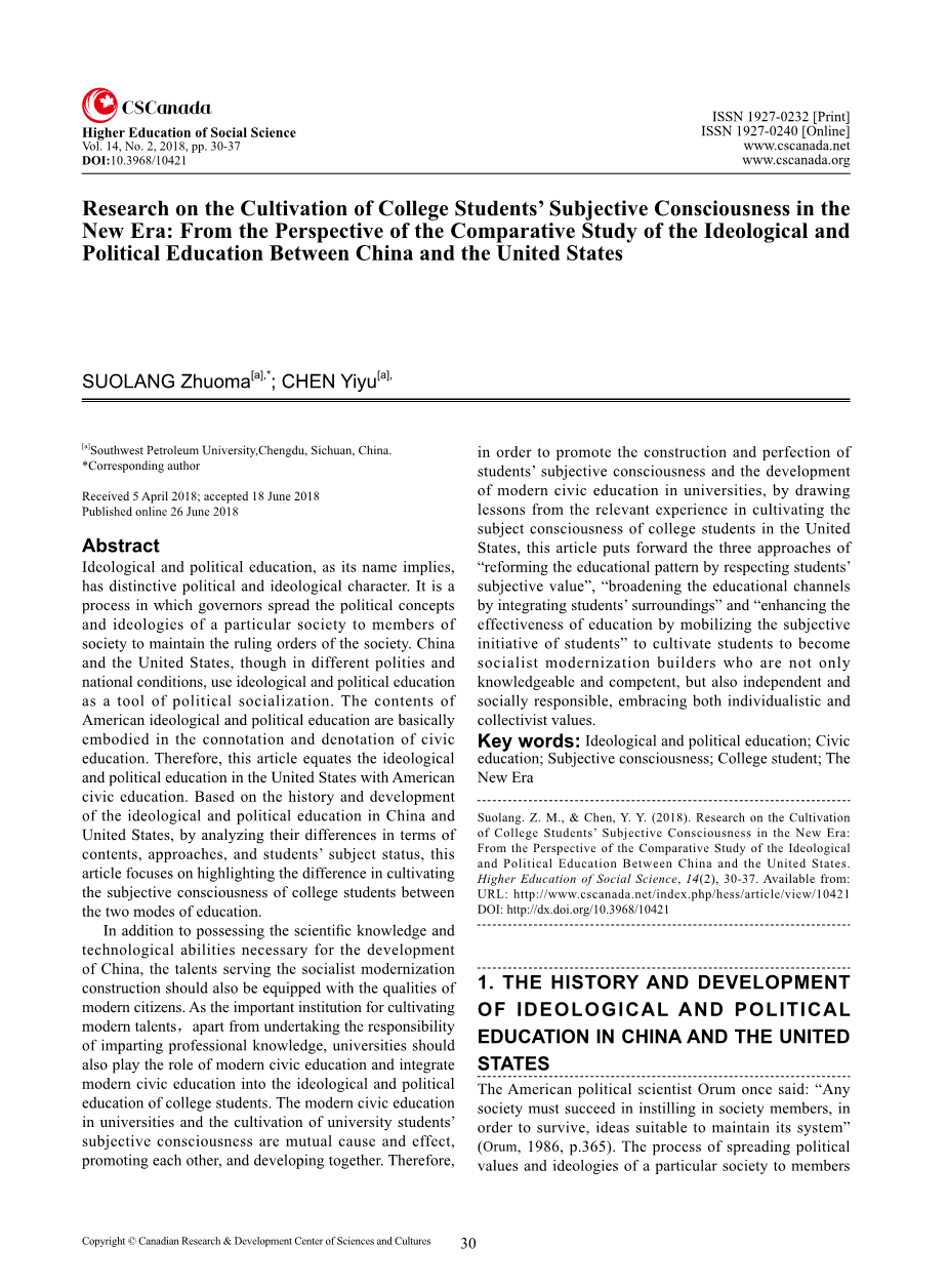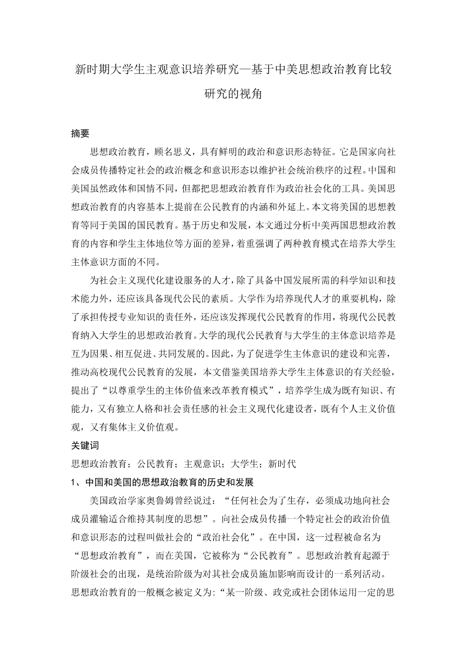 新时期大学生主观意识培养研究—基于中美思想政治教育比较研究的视角外文翻译资料
