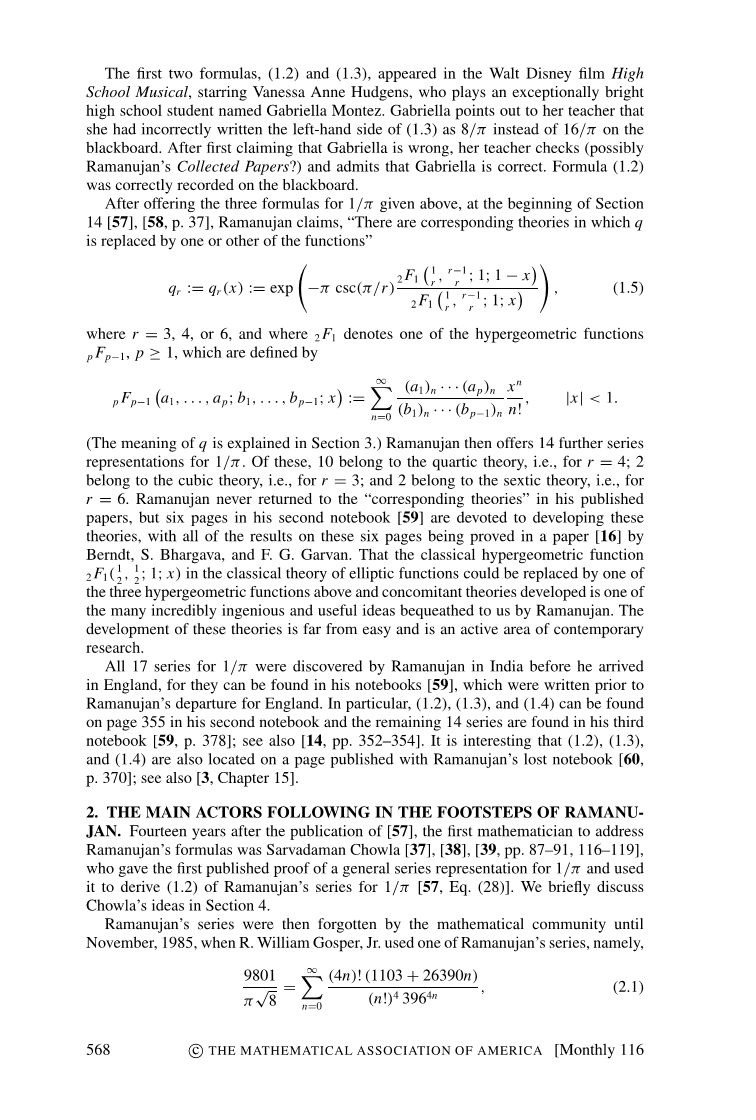 前两个公式, (1 .2)和 (1 .3),出现在Walt Disney电影《高中音乐剧》 中, 由Vanessa Anne Hudgens主演,她饰演一个非常聪明的高中生Gabriella Montez。Gabriella向她的老师指出,她把(1.3)的左边错写成了16/ pi;, 正确的应该是8/ pi;。在Gabriella指出老师的错误后,她的老师检查了一下(可能是Ramanujan的论文集)并承认Gabriella是正确的。公式( 1.2)被正确地记录在黑板上。在给出上述1/ pi;的三个公式后,在论文[57],[58,p. 37]第14节的开始部分写道“有相应的理论认为q被其中一个或其他函数所取代”: