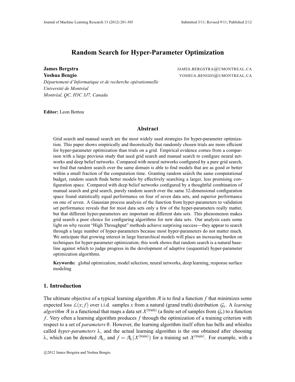 网格搜索和人工搜索是超参数优化中应用最广泛的策略。本文从经验和理论两方面证明了随机选择试验比网格试验更能有效地优化超参数。经验证据来自与之前使用网格搜索和手动搜索来配置神经网络和深度信念网络的大型研究的比较。与纯网格搜索配置的神经网络相比,我们发现,在同一个域上的随机搜索能够在一小部分计算时间内找到同样好的或更好的模型。给随机搜索相同的计算环境,随机搜索能通过有效地搜索更大、更少前景的配置空间来找到更好的模型。与人工搜索和网格搜索相结合配置的深度信念网络相比,在相同的32维配置空间中,纯随机搜索在7个数据集中的4个数据集上的性能在统计上是相同的,而在7个数据集中的1个数据集上的性能更优越。对函数从超参数到验证集性能的高斯过程分析表明,对于大多数数据集,只有少数超参数是真正重要的,但不同的超参数对不同的数据集是重要的。这种现象使得网格搜索成为为新数据集配置算法的糟糕选择。我们的分析揭示了为什么最近的“高吞吐量”方法取得了惊人的成功——它们似乎搜索了大量的超参数,因为大多数超参数并不重要。我们预计,对大型层次模型的日益增长的兴趣将给超参数优化技术带来越来越大的负担;这项工作表明,随机搜索是判断自适应(顺序)超参数优化算法发展进展的自然基线。