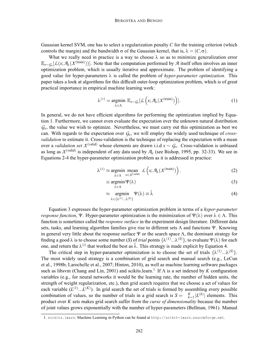 一般来说,我们没有有效的算法来执行等式1所暗指的优化。此外,我们甚至无法评估未知自然分布Gx的期望值,即我们希望优化的值。然而,我们必须尽可能地进行优化。关于对Gx的期望,我们将使用广泛使用的交叉验证技术来估计它。交叉验证是用验证集X(有效)上的平均值替换期望值的技术,验证集X(有效)的元素以i.i.d Xsim; Gx。交叉验证是无偏的,只要X(有效)与lambda;使用的任何数据无关(见Bishop,1995,第32-33页)。我们在方程式2-4中看到了实际解决的超参数优化问题: