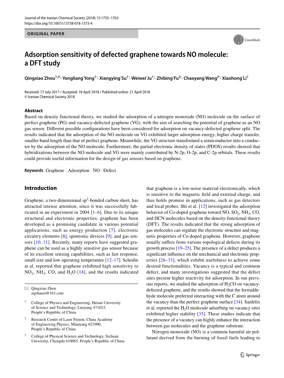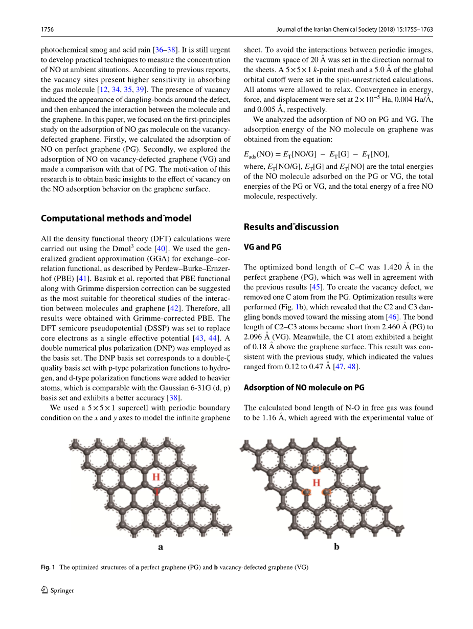 在这项工作中,我们使用密度泛函理论系统地描述了NO分子在理想石墨烯和空位缺陷石墨烯上的吸附,考虑了不同的吸附结构,并对其进行了原子结构、几何参数和电子性能测试。结果表明,理想石墨烯与NO分子的相互作用较弱。空位缺陷的存在增强了NO分子的吸附稳定性。有趣的是,N-O原子在O-C1体系中表现出离解态,与石墨烯的C1原子形成化学键。结果表明,NO分子的吸附使电导发生了明显的变化,可以作为检测NO分子的信号。