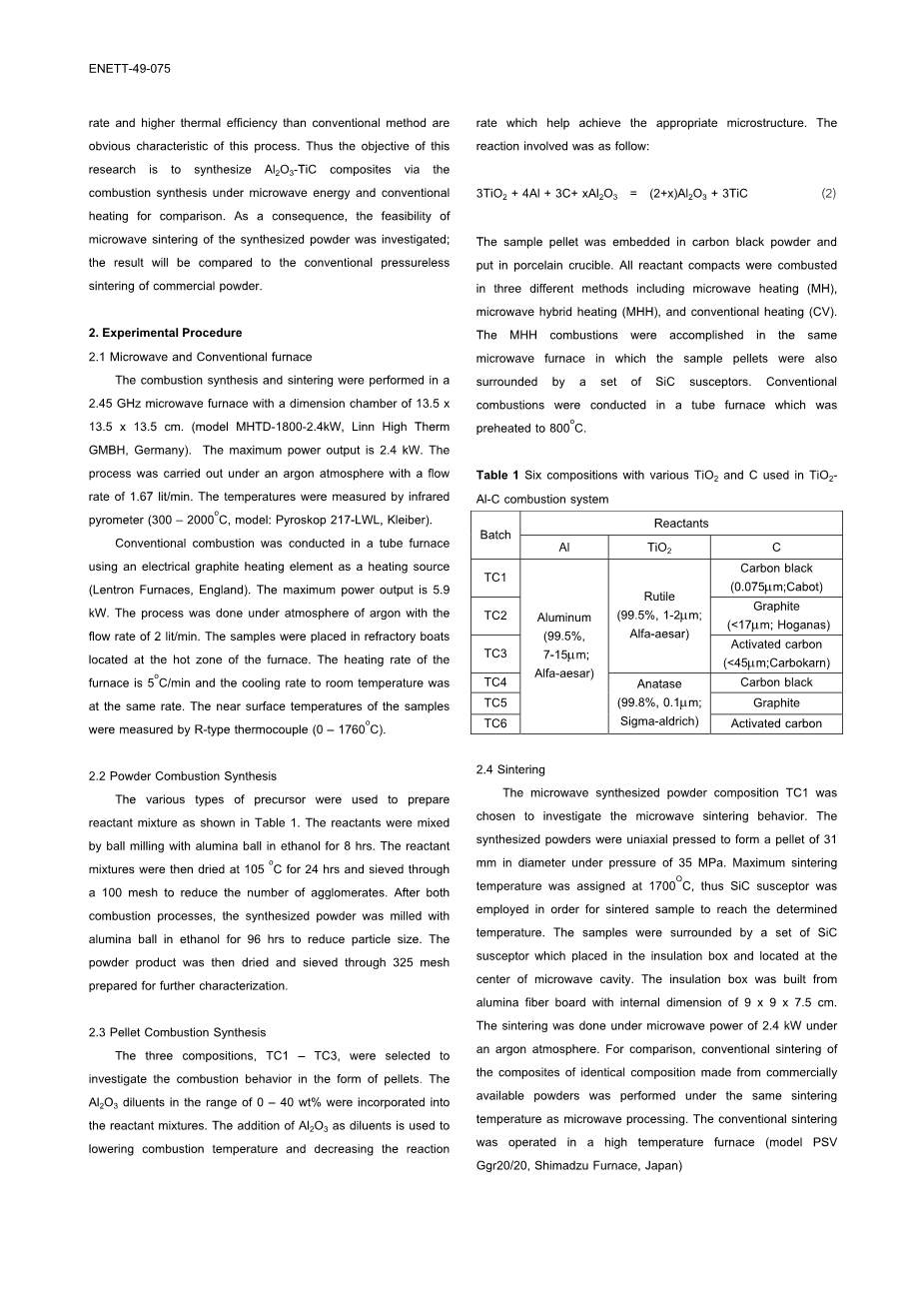 在这项工作中,应用微波能辅助Al2O3-TiC粉末和颗粒的燃烧合成。另外,合成粉末也在微波能量下烧结。 Al2O3-TiC复合材料由于其强度高而被广泛用作切削刀具,并且近来作为计算机硬盘驱动器中的磁记录头基底应用。通常,这种商品陶瓷复合材料是通过将Al2O3和TiC粉末直接混合,然后进行无压烧结,热压和热等静压来制造的[3,4]。一种替代的方法引起了人们对合成该复合材料的关注,即自蔓延高温合成(SHS)或燃烧合成。这种方法提供了几个优点,包括简单,节能和使用低成本前驱体。微波技术和SHS过程的结合可能是降低能量的更好方法。 Al203-TiC的燃烧合成可描述如下: