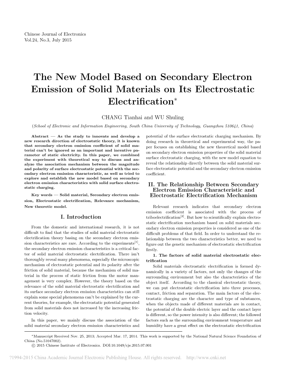 关键词:固体材料,二次电子发射,静电带电,关联机制,新的理论模型。