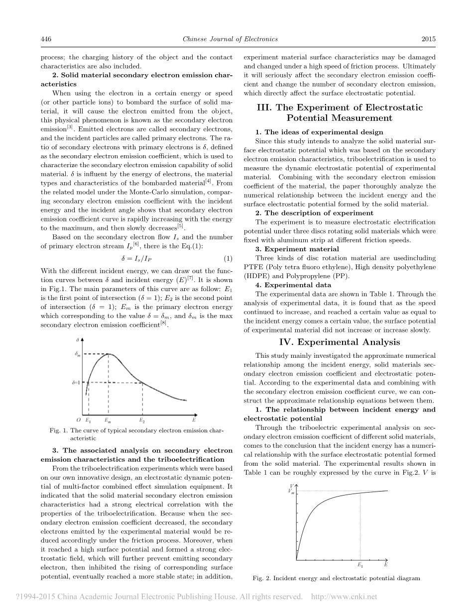 其中k1和k2是相关系数。它们的价值取决于固体材料和二次电子发射系数。以PTEE为列,其最大二次电子发射系数delta;m=3.0其对应的能量Em=300V时,通过经验推导方程[9]