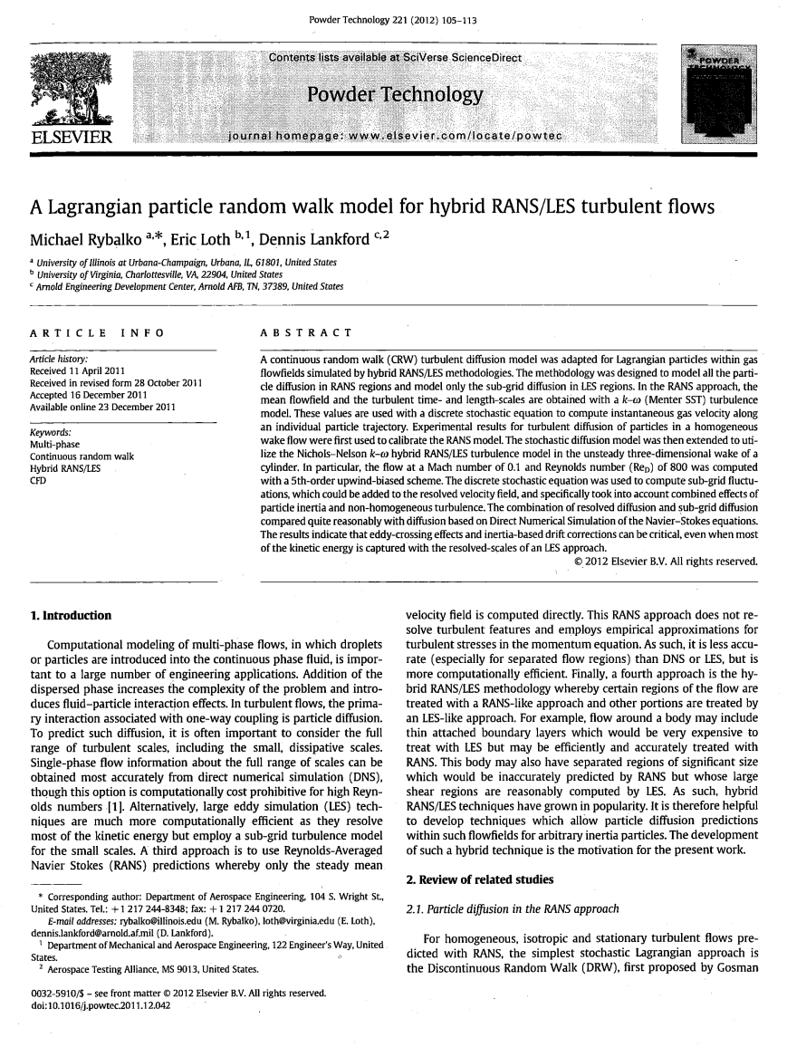 连续随机行走湍流扩散模型适用于用混合RANS/ LES湍流方法仿真拉格朗日粒子在气体环流中的运动。这一方法被设计去模拟所有在RNS区域的粒子扩散和模拟仅在LES区域的分格扩散。在RNS方法中对于湍流扩散模型在尾流的非定常三维唤醒实验结果进行了首次用于校准RANS模型。然后,随机扩散模型扩展到利用尼科尔斯 - 尼尔森K-w混合RANS在气缸,特别的不稳定三维尾/ LES湍流扩散模型,在8000.1雷诺数()马赫数流动在计算了5阶迎风偏置方案。离散随机方程用于计算分格波动,其可以被添加到已解析速度场,并具体地考虑到了颗粒的惯性和非均质的湍流帐户联合作用。解决扩散和分格扩散的组合相比,相当合理与基于Navier-Stokes方程的直接数值模拟扩散。结果表明,涡渡效果和基于惯性漂移校正可以是关键的,即使当大部分动能是与解决大规模的LES方法捕获。