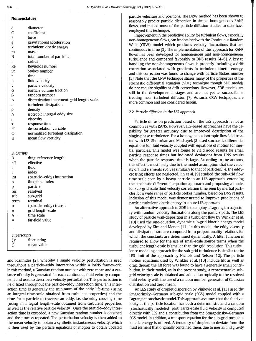 基于对大涡模拟方法粒子扩散的预测并不像RANS一样普遍。然而,基于LES方法具有更大的准确性的能力由于改善的单相湍流描述。Shotorban和Mashayek[8]使用随机微分方程再加上惯性粒子的运动方程流体速度。这种模式被认为产生的微小颗粒良好的效果响应时间为大。根据作者,这种效果是很可能是由于该模型假设流体元件的速度同样发展到该粒子,Le.涡流渡效果忽略不计。Jin等在[9]研究了分格流时间尺度似乎通过在LES方法一重粒子,延长了随机微分方程的方法,并提出了亚网格尺度流体速度相关时间的模型由惯性颗粒的似乎广泛的颗粒Stokes数,基于DNS的结果。这种模式纳入经证实可以改善在纯LES方法颗粒湍流动能的预测。